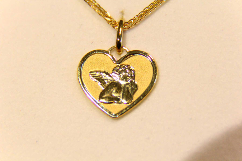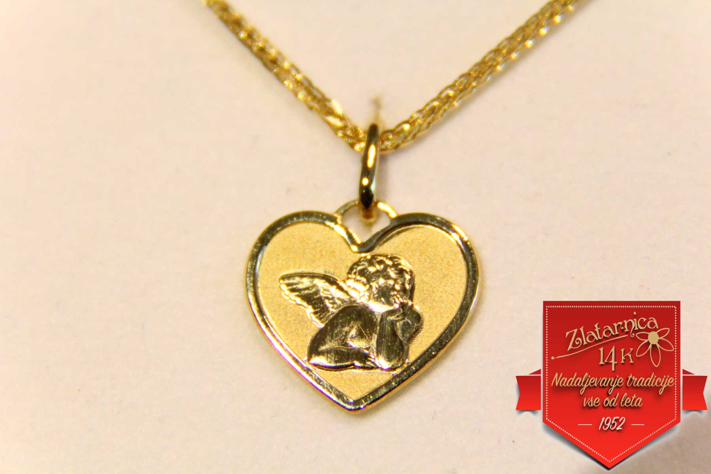 Obesek v oblki srčka, s podobo angela na peskani podlagi. Na hrbtni strani je možna gravura.