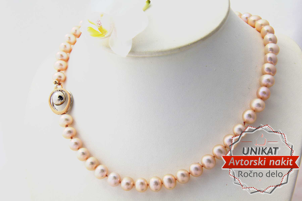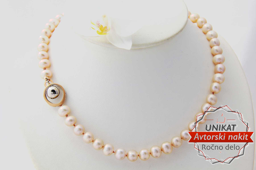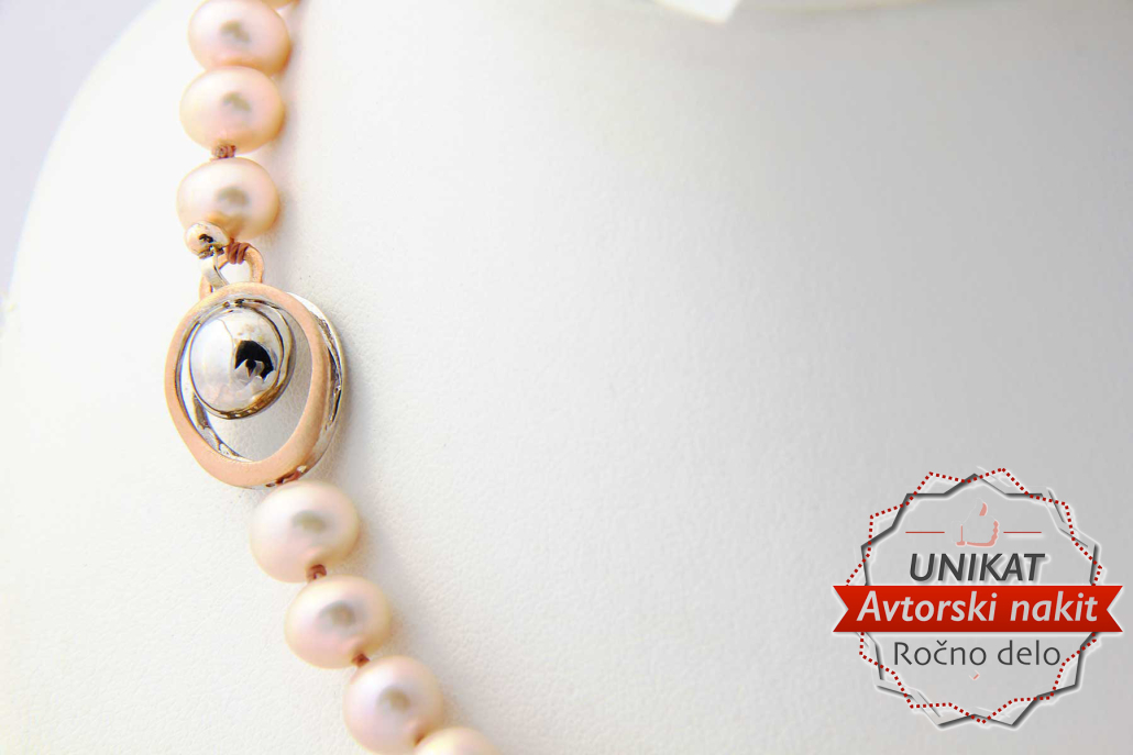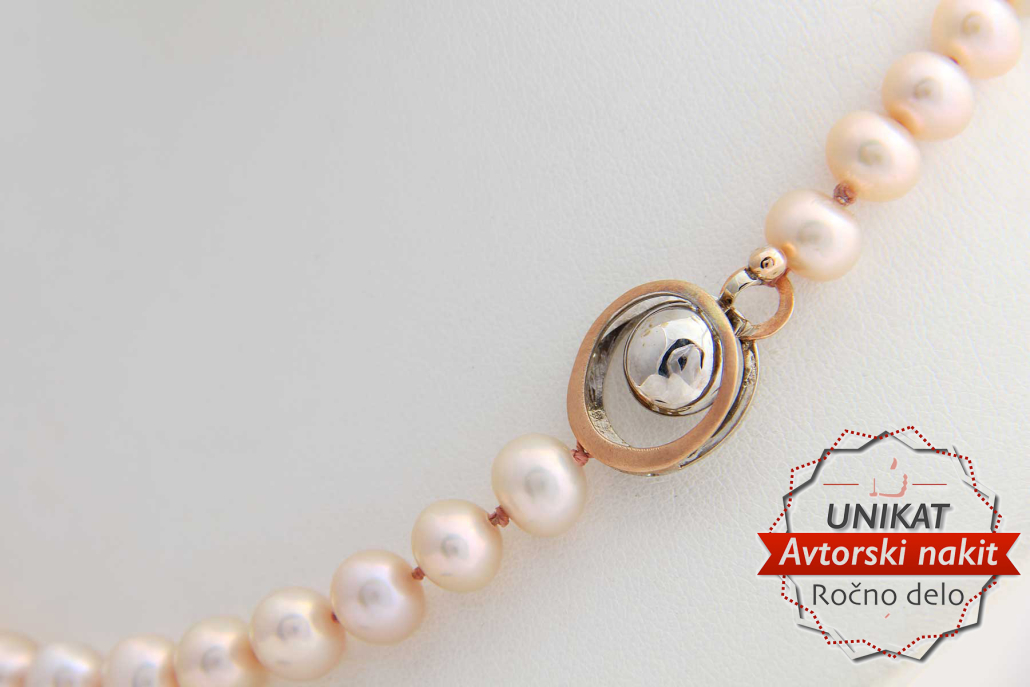 Ogrlica iz naravnih roza sladkovodnih biserov nizanih na vozle, z dizajnerskim, unikatnum zapiralom v kombinaciji belega in rose zlata.