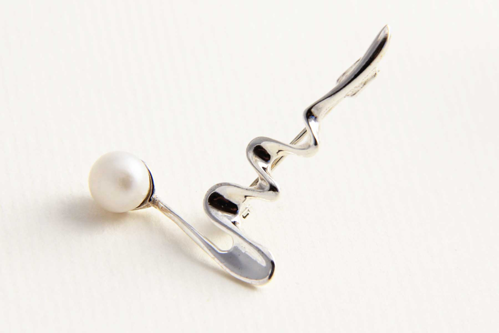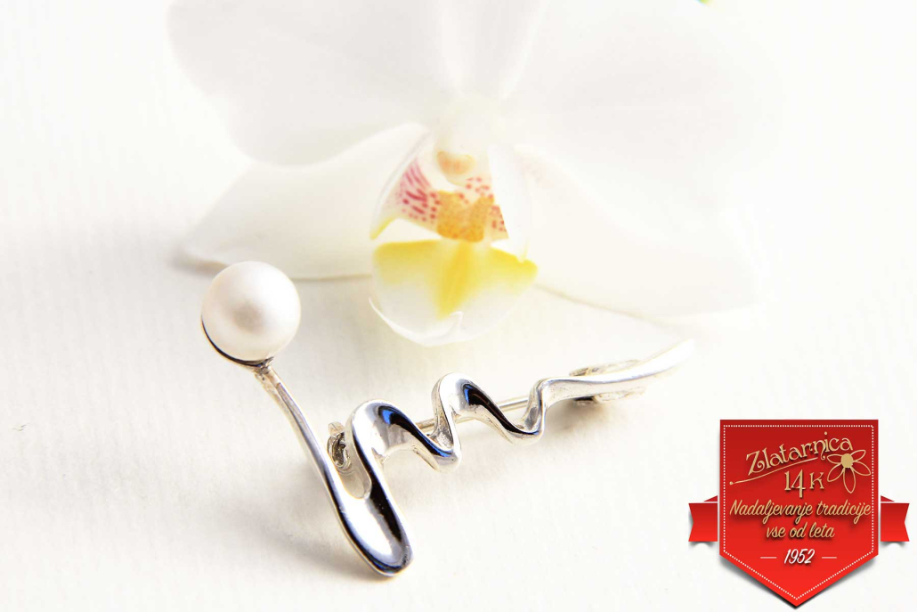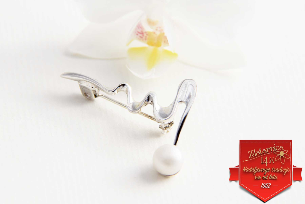 Elegantna broška v obliki zanimive vijuge z belim biserom Swarovski.