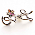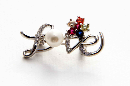 Elegantna broška v obliki napisa Love z biserom Swarovsi in barvnimi cirkoni.