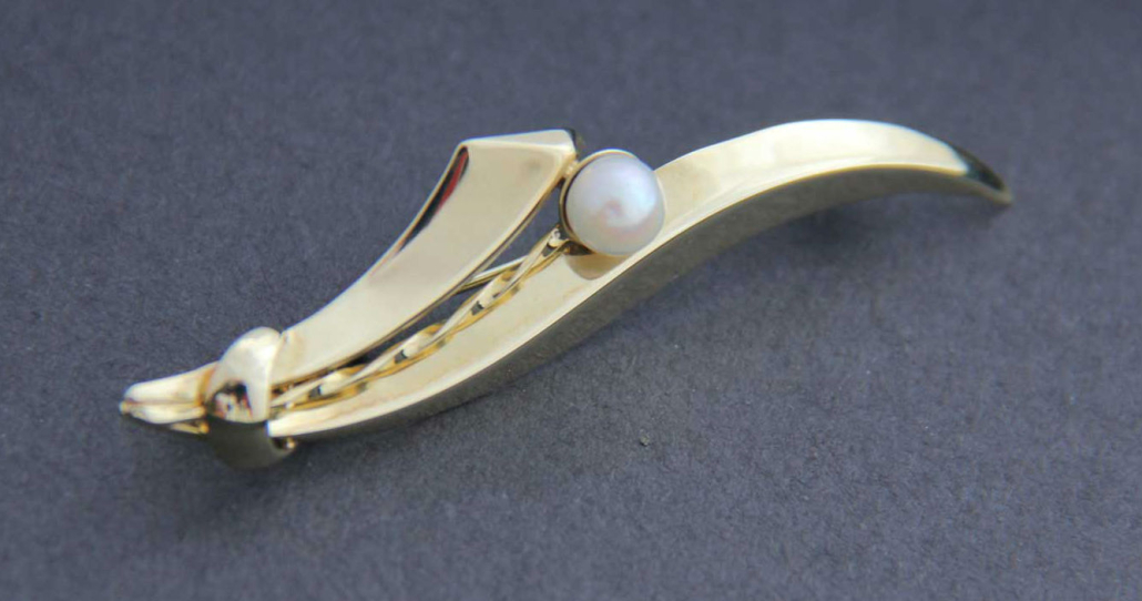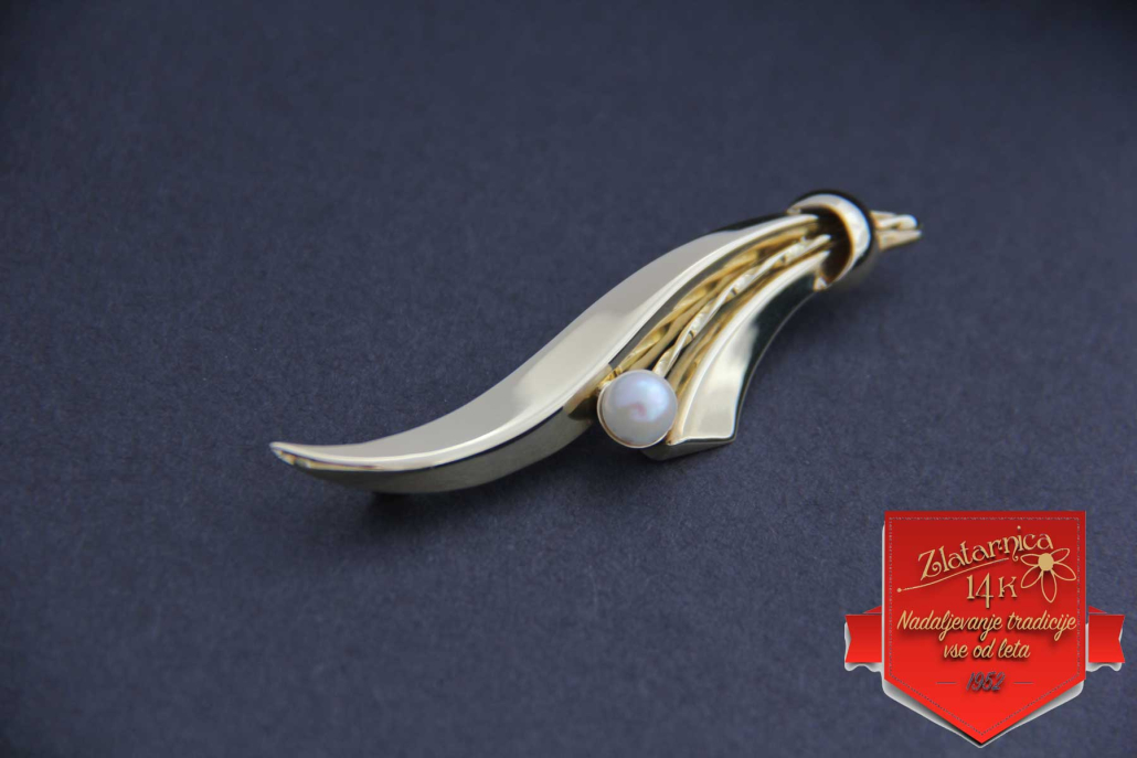 Broška iz rumenega zlata v obliki nagelnovih listov, med katerimi je beli sladkovodni biser.