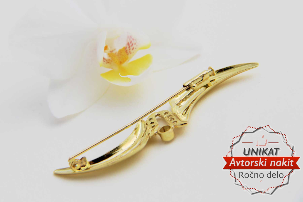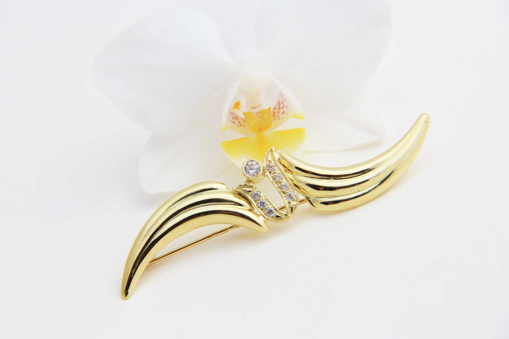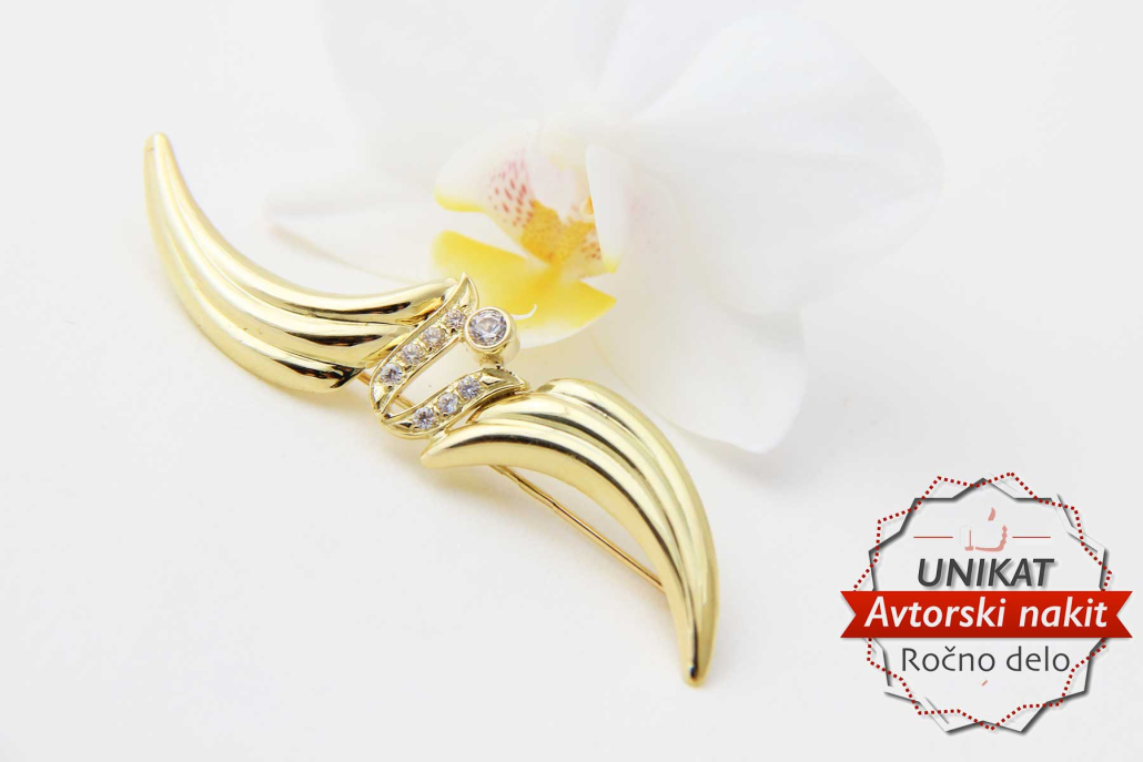 Elegantana unikatna broška iz rumenega zlata okrašena s cirkoni.