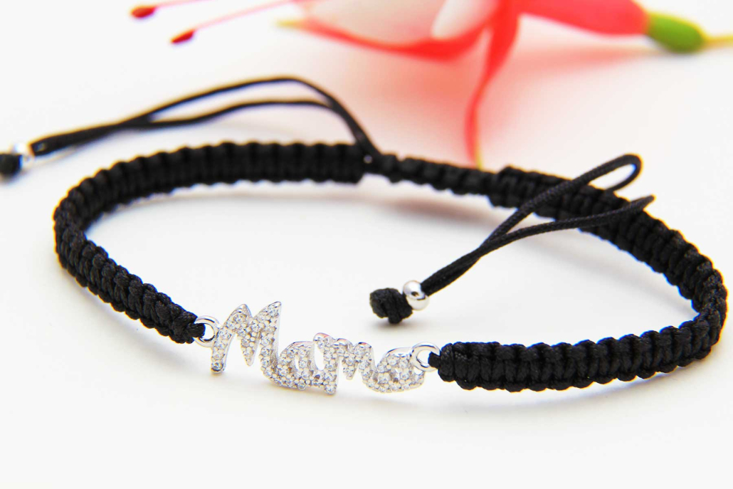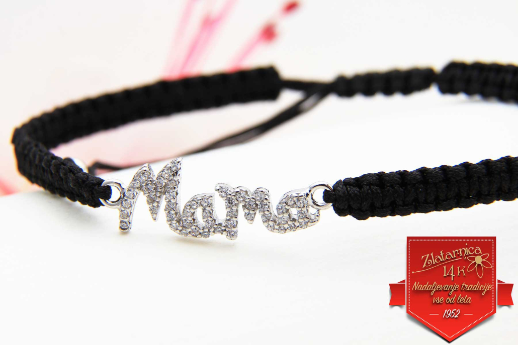 Zapestnica iz tekstilne vrvice z napisom *Mama* obdelanim s cirkoni. Izvirno darilo ob rojstvu otroka ali za materinski dan.