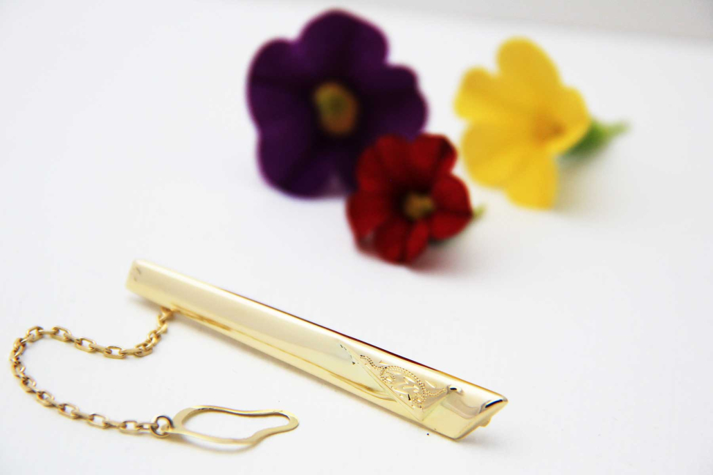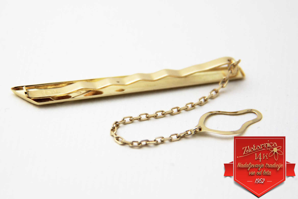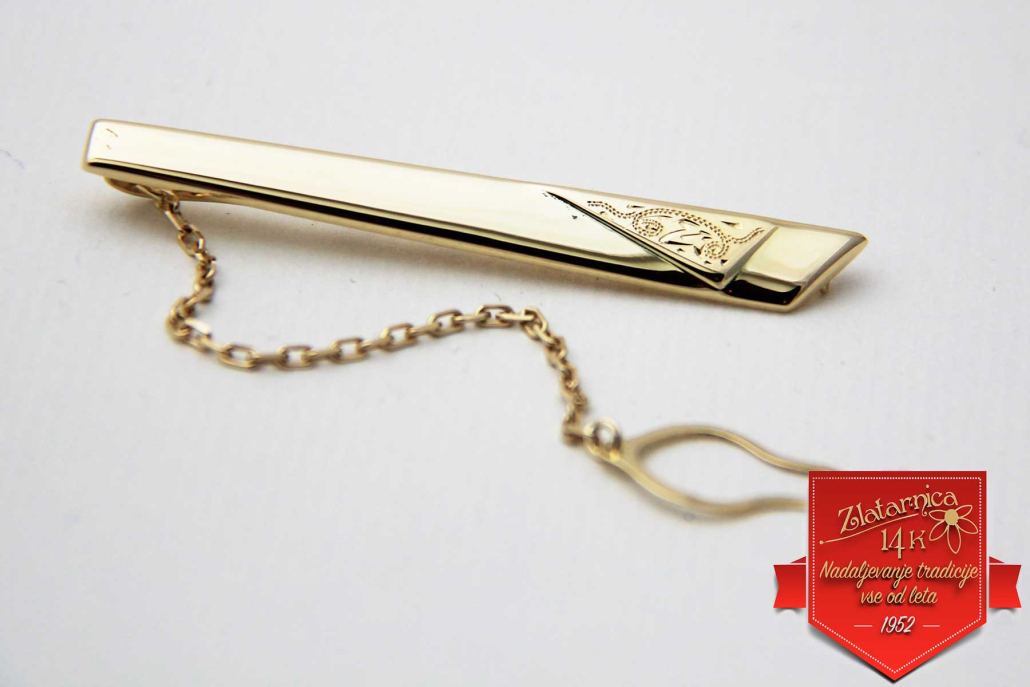 Kravatna igla z varnostno verižico in okrasno baročno gravuro.