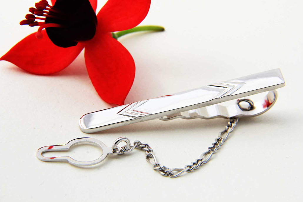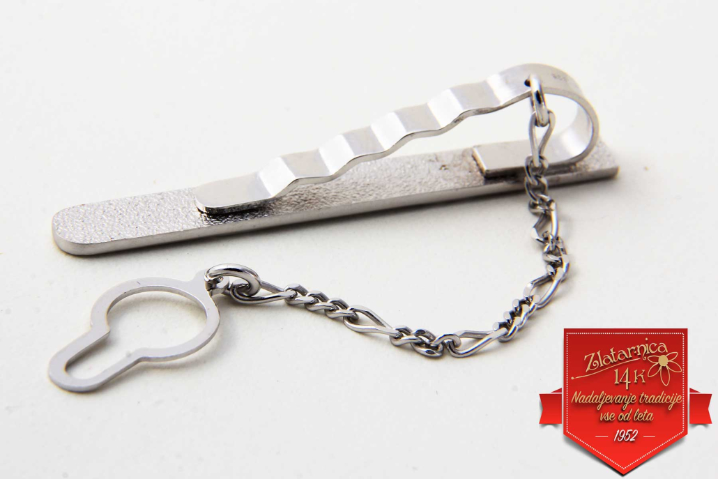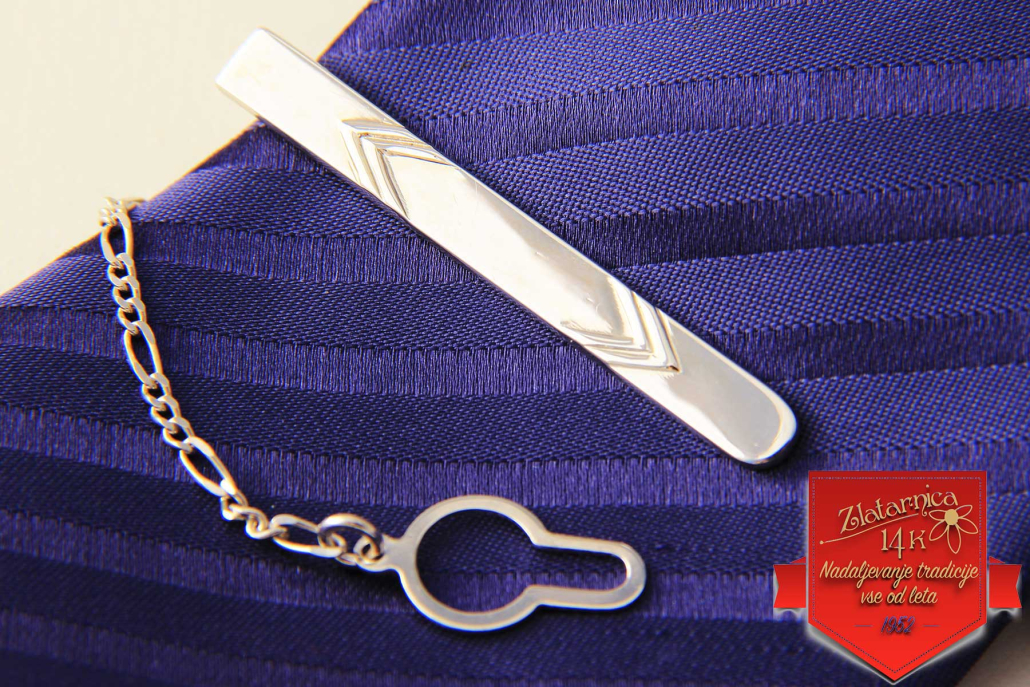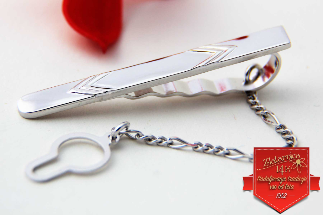 Srebrna kravatna igla z vzorci dveh nasproti stoječih puščic, med katere je možno tudi gravirati.