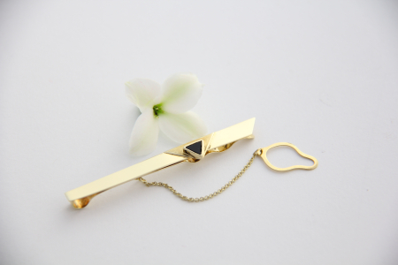 Unikatna kravatna igla z oniksom, ki ima pripeto varnostno verižico.