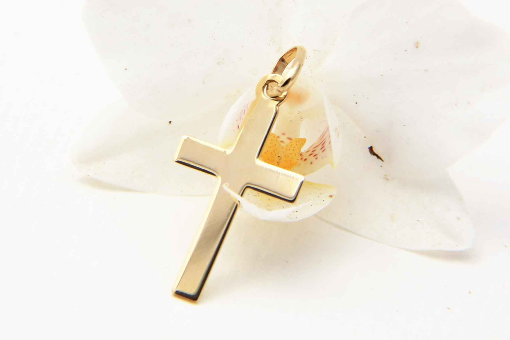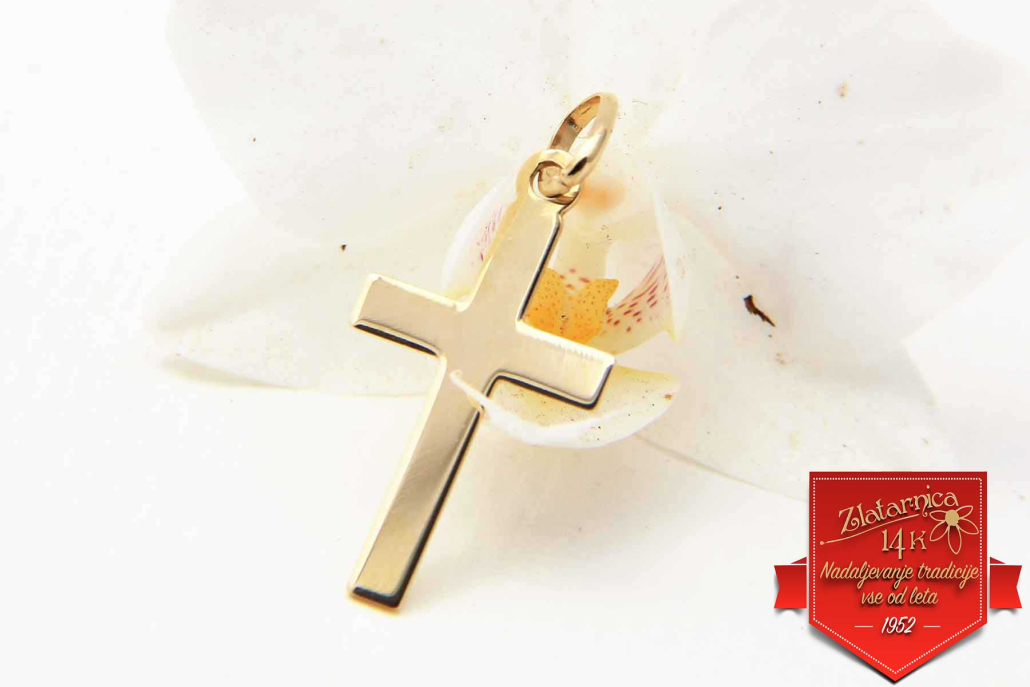 Obesek v obliki križa iz rumenega zlata z gladko površino.