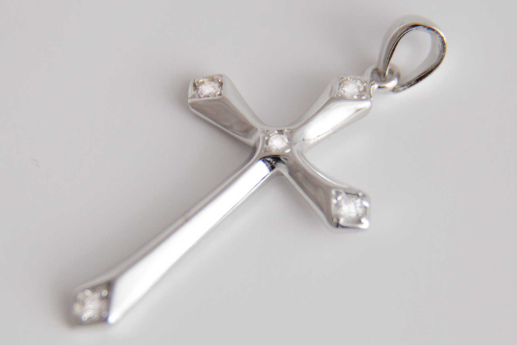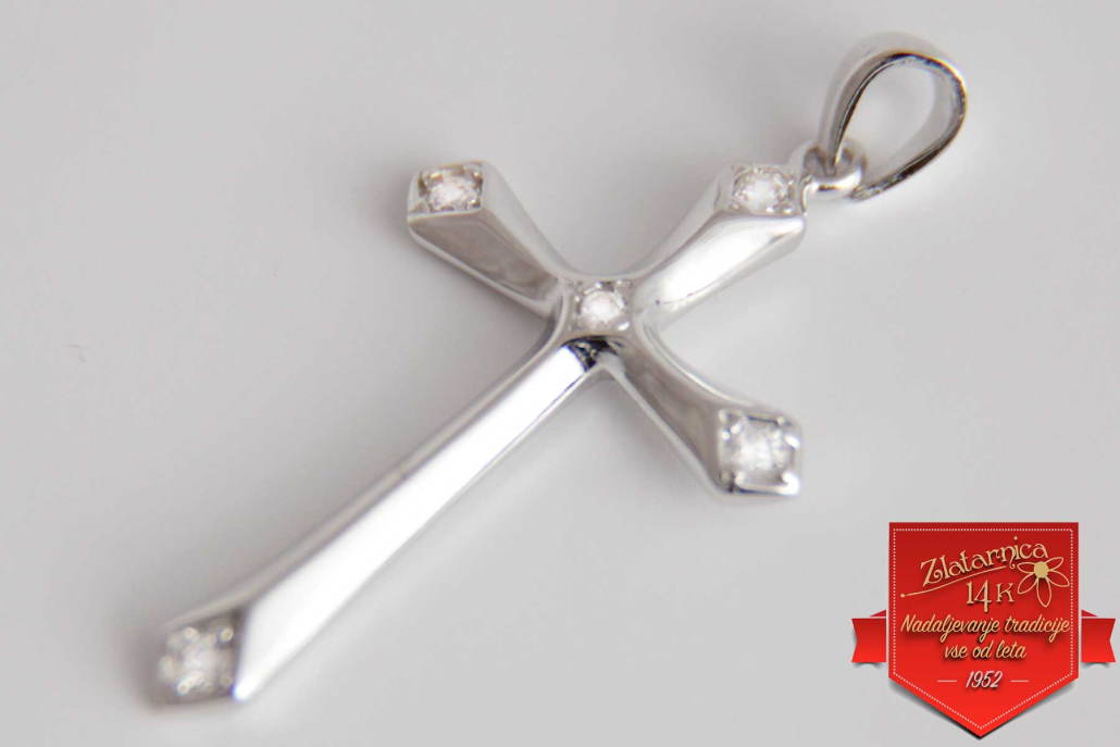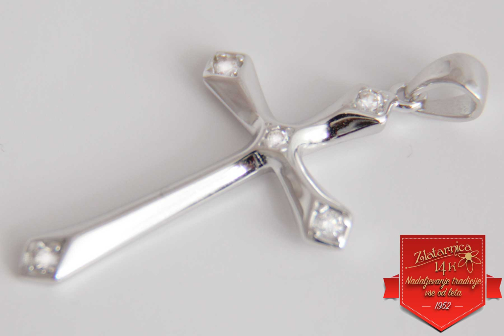 Srebrni križ konusnih linij, v sredini in na koncu krakov je obelan s cirkoni.