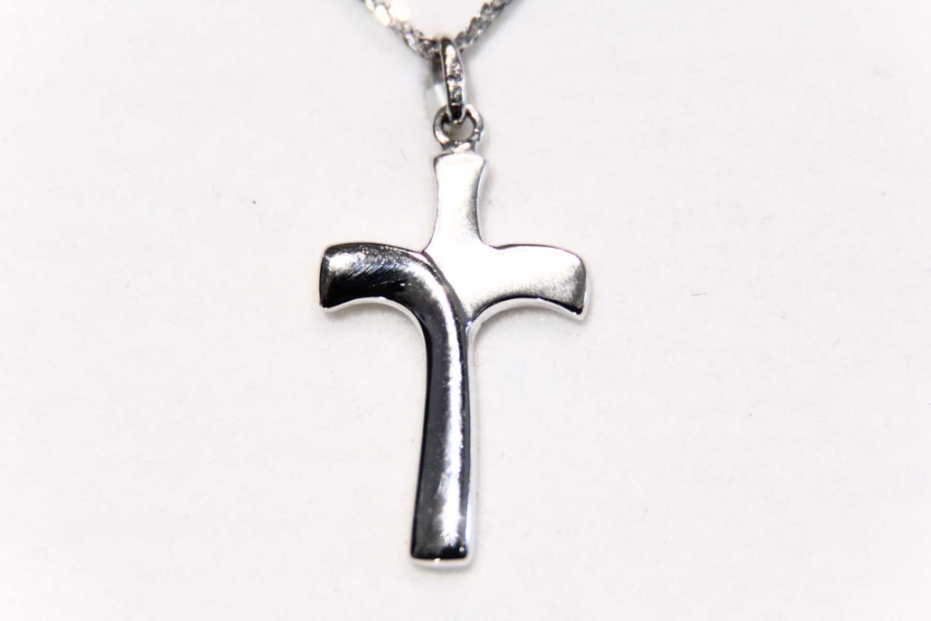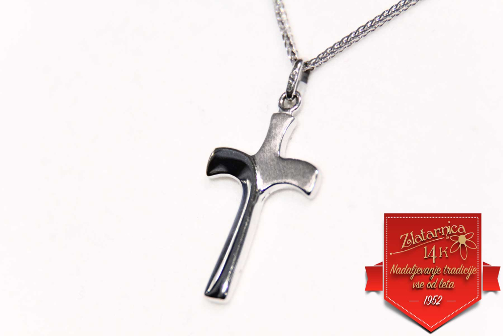 Obesek križ iz belega zlata, ki je razdeljen na matiran in poliran del.
