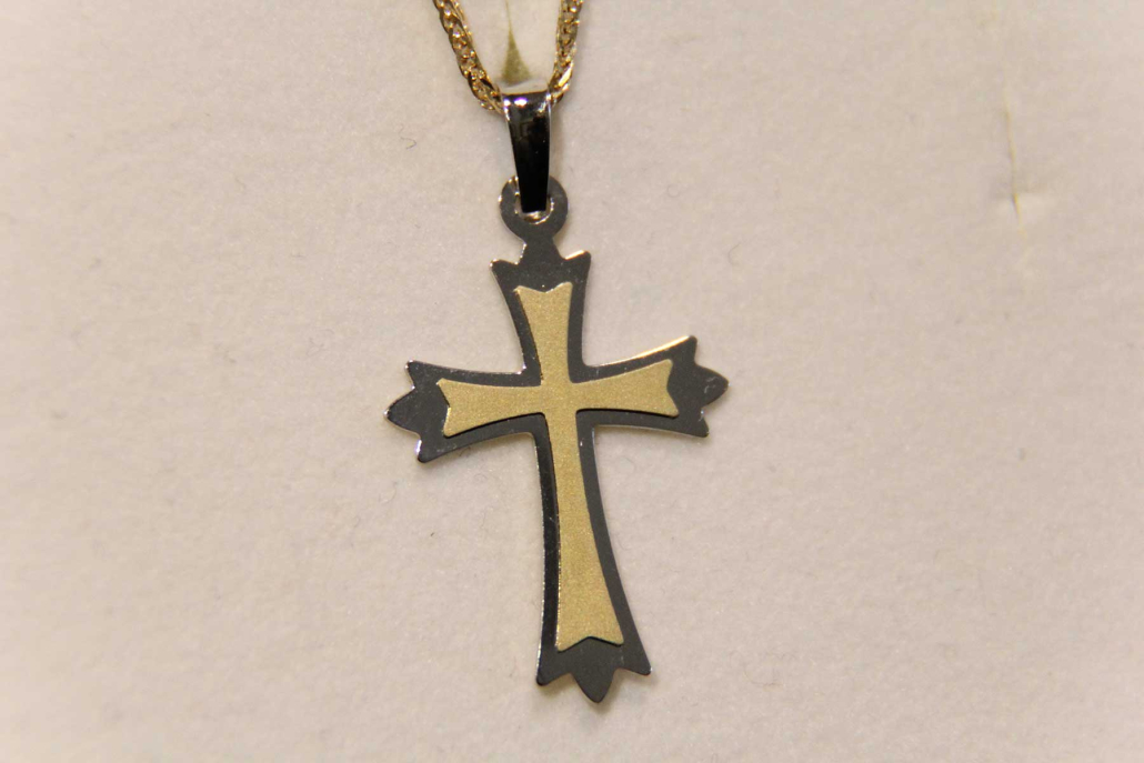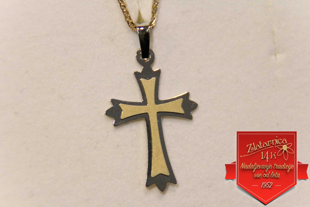 Obesek v obliki križa iz poliranega belega zlata v podlagi in nanešenega manjšega križca iz matiranega rumenega zlata.