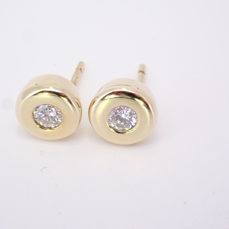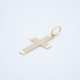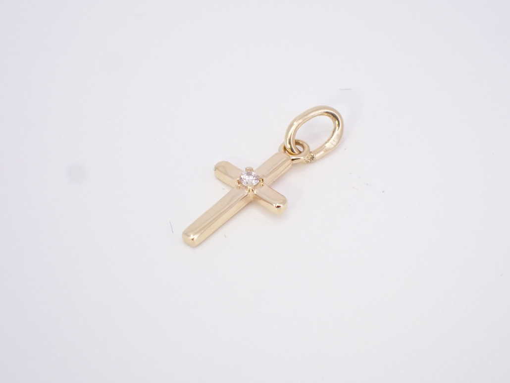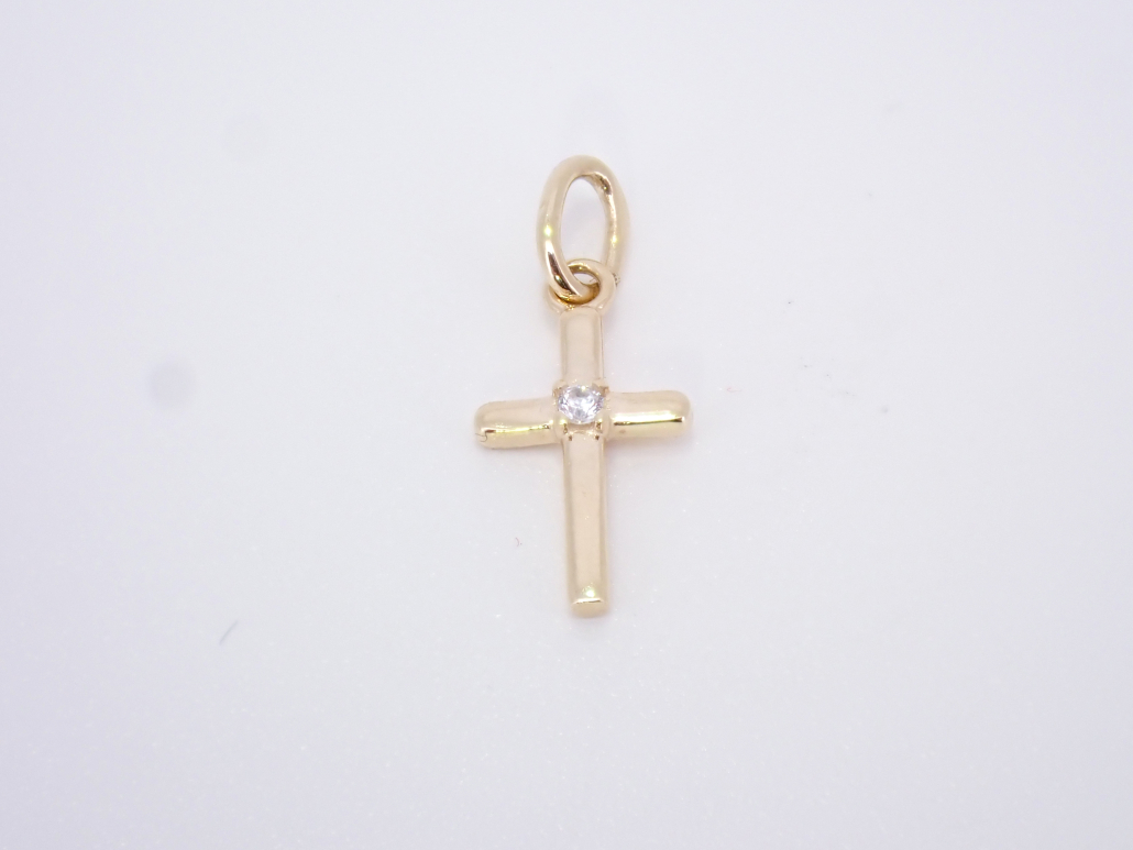 Križ iz rumenega zlata z gladko površino okrašeno s cirkonom.