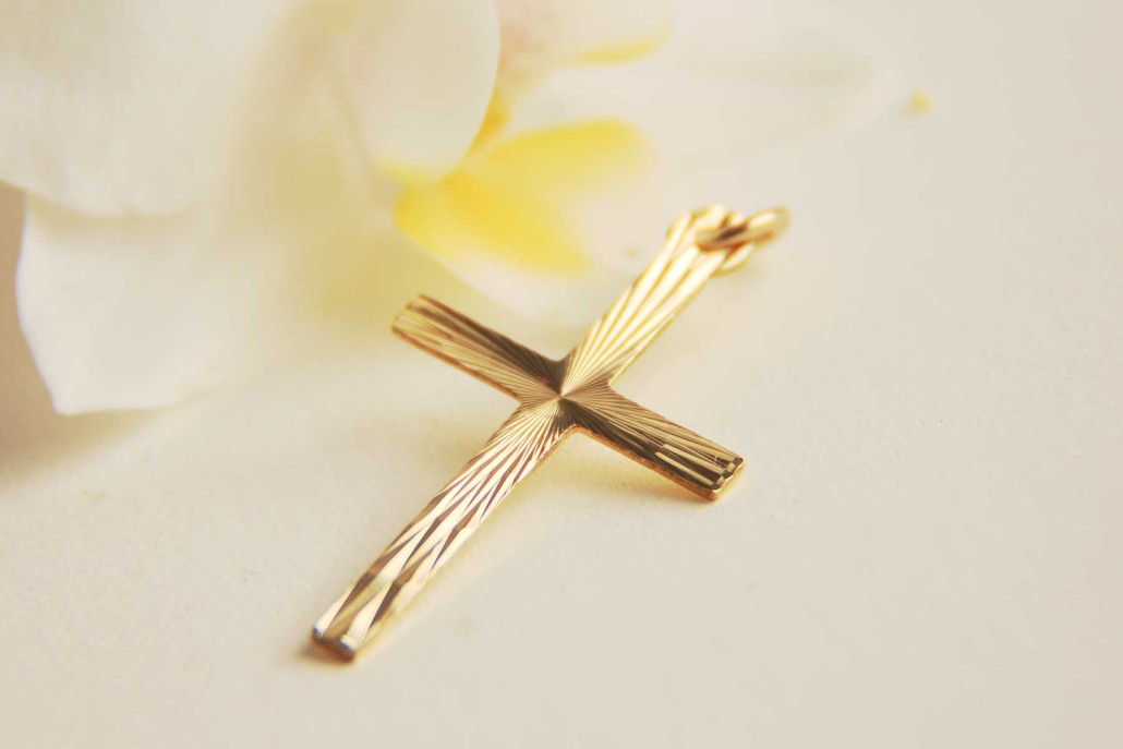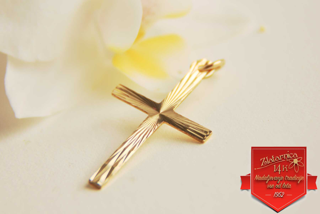 Obesek v obliki križca iz rumenega zlata z gravuro črt – žarkov.