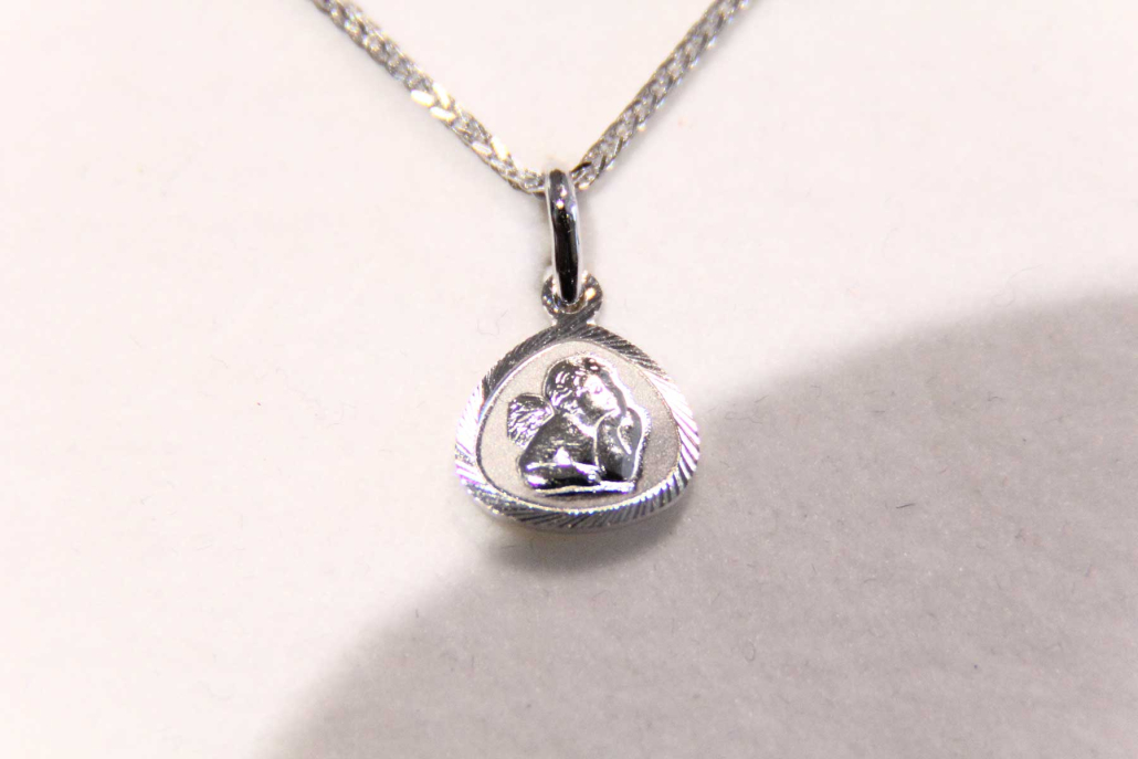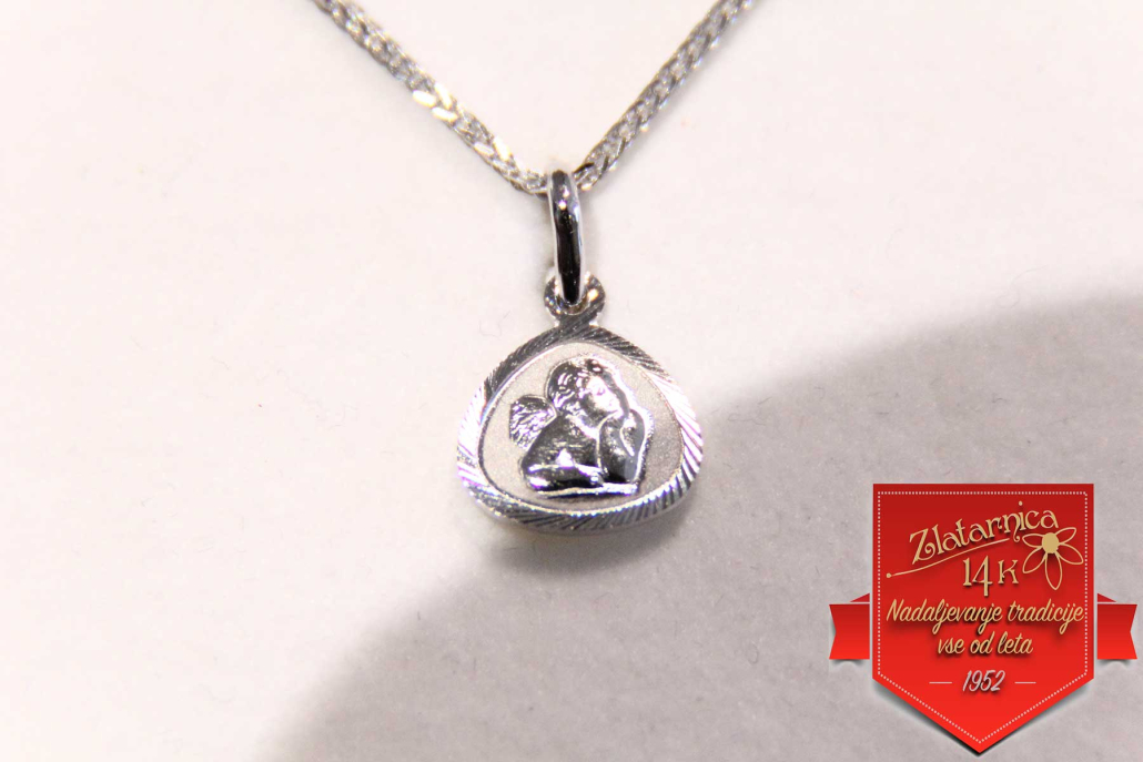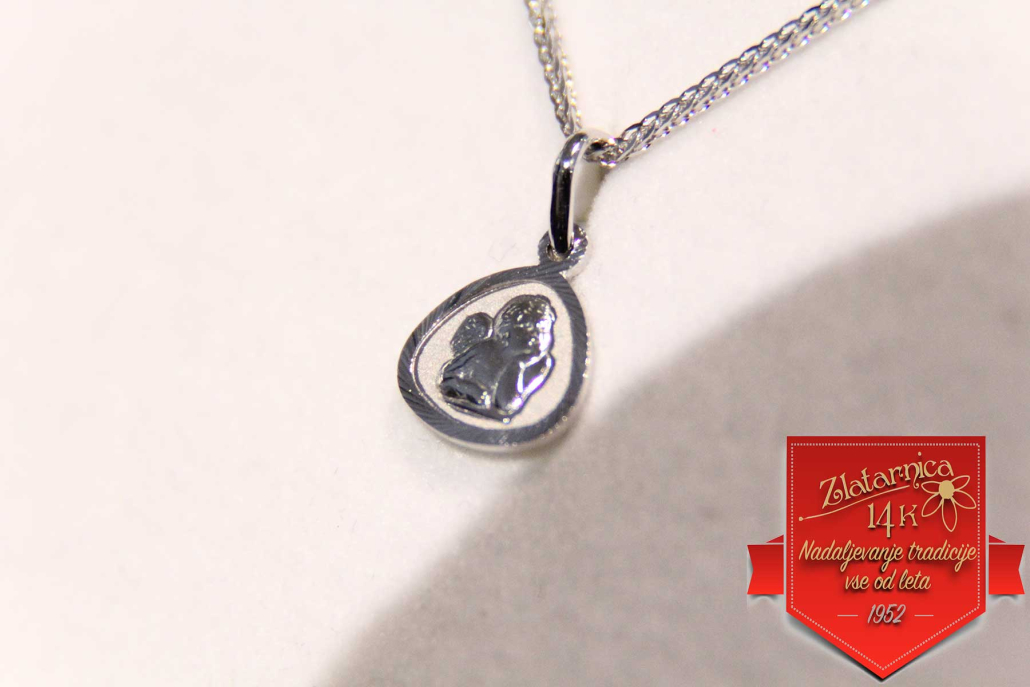 Obesek iz belega zlata, angelček na peskani podlagi v obliki kapljice, z diamantirano obrobo.