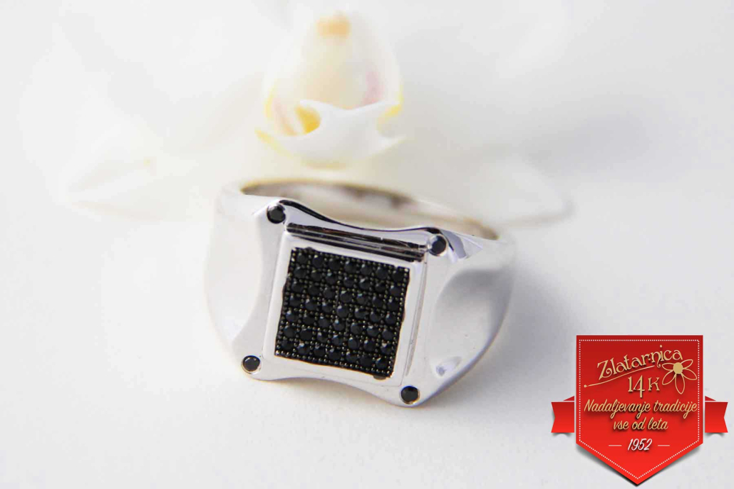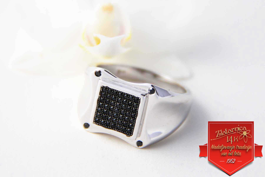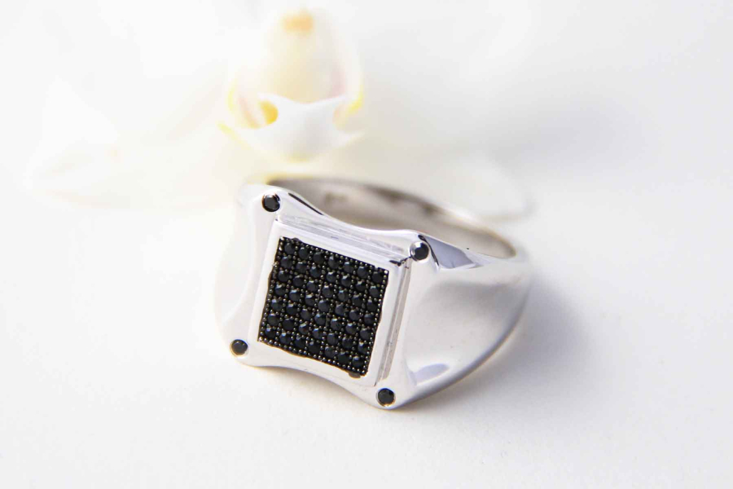 Modni moški pečatni prstan, okovan s črnimi cirkoni v kvadratnem polju in na kotih.