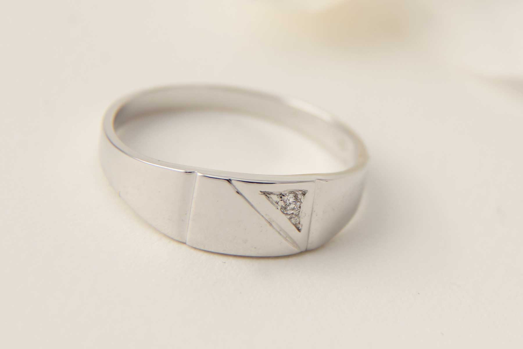 Moški prstan iz belega zlata s cirkonom v trikotnem polju.