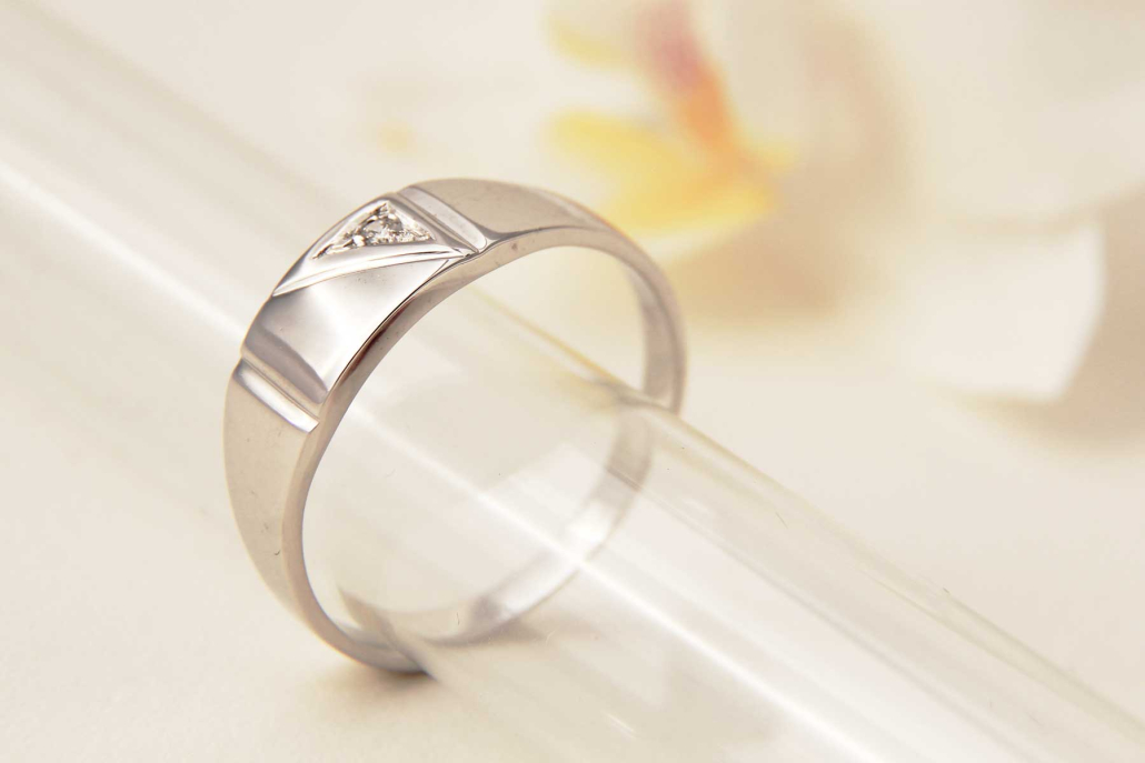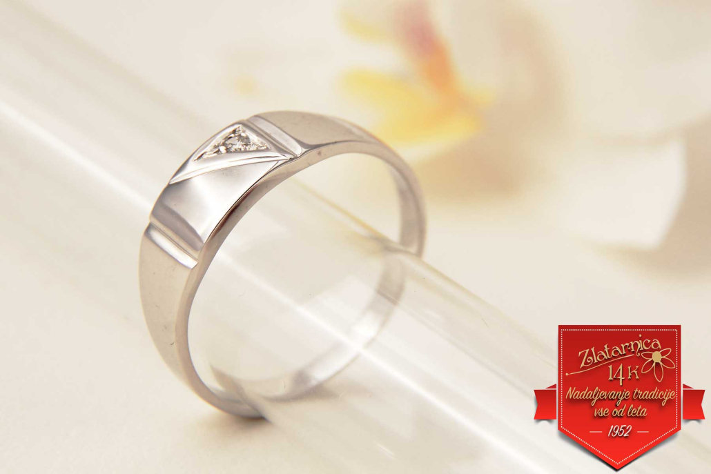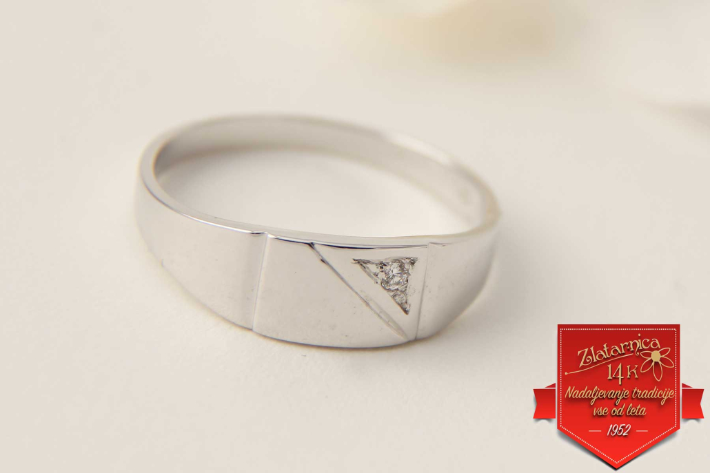 Moški prstan iz belega zlata ki ima v trikotnem polju vkovan cirkon.