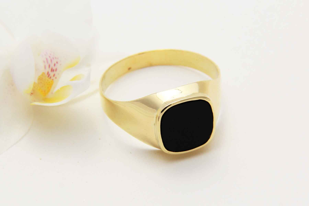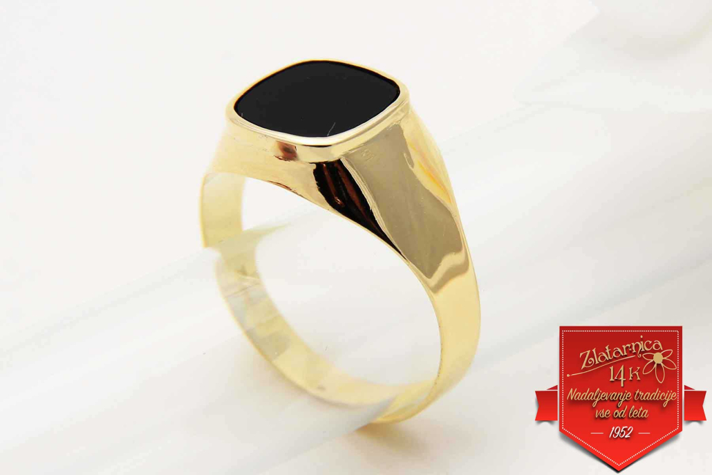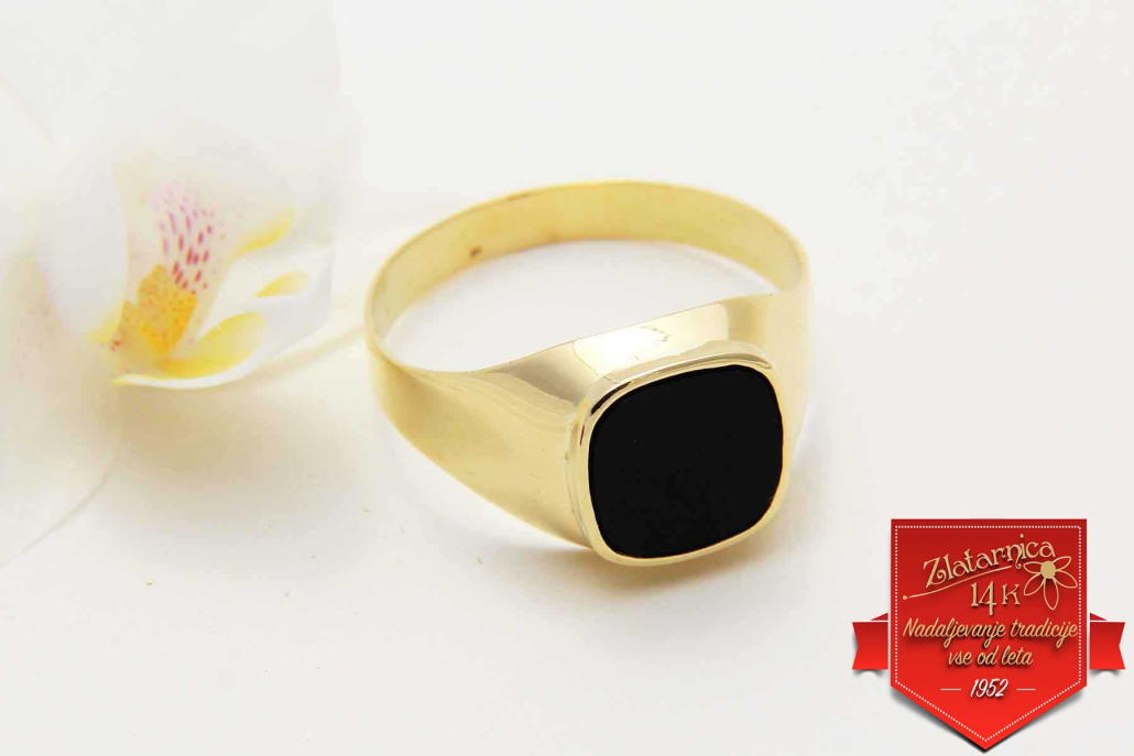 Klasični moški prstan iz rumenega zlata z vkovanim naravnim oniksom.