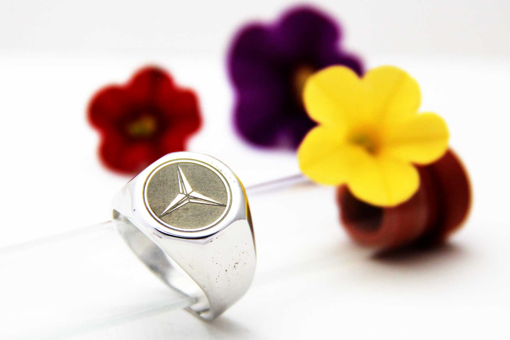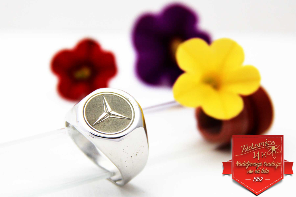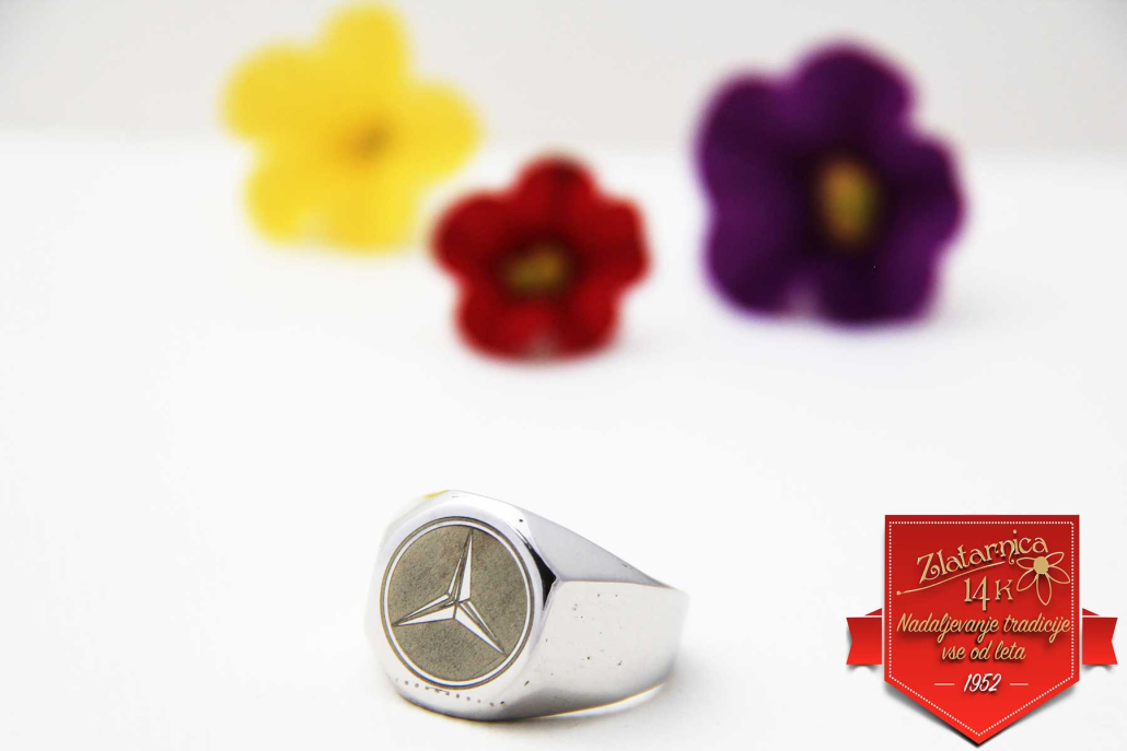 Moški pečatni prstan iz srebra z vgravirano mercedesovo zvezdo na okrogli matirani podlagi.