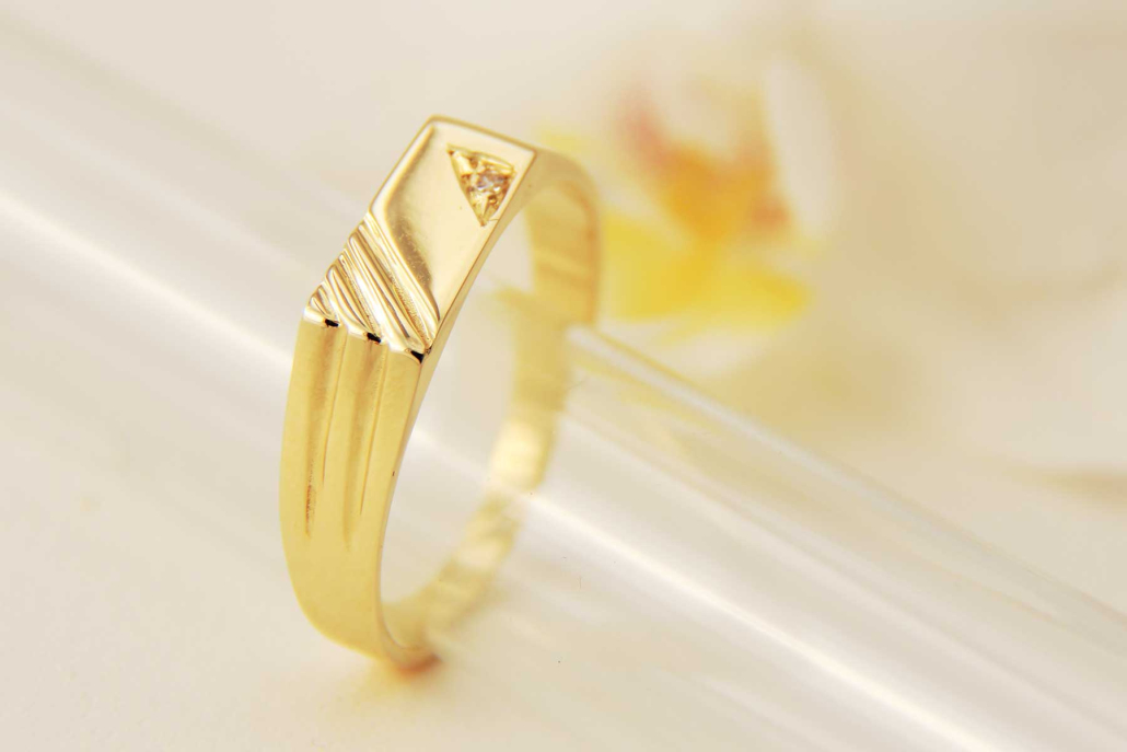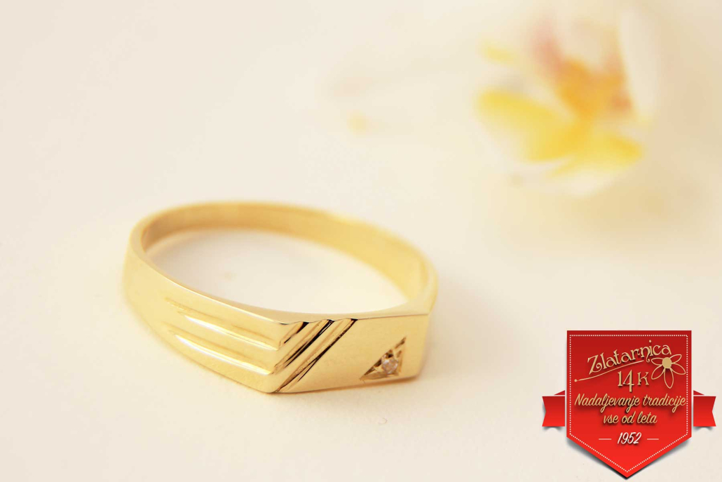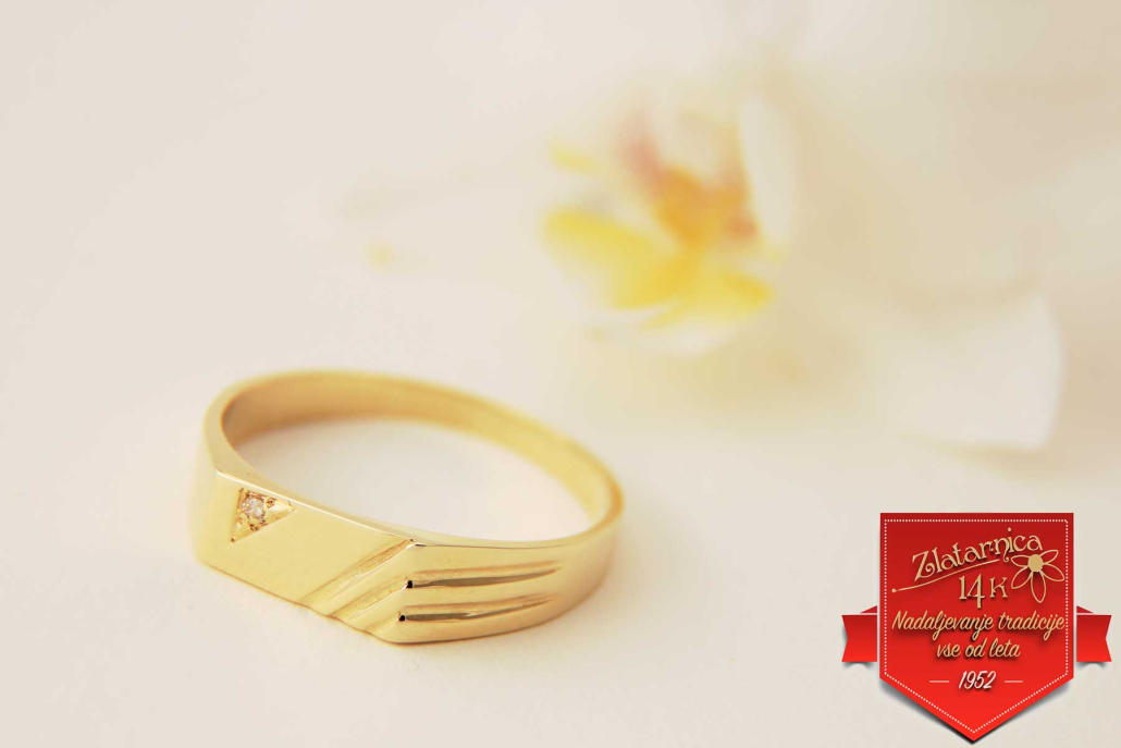 Moški prstan iz rumenega zlata s cirkonom v trikotniku, prečnimi linijami zgoraj in vzdolžnimi linija po oboču.