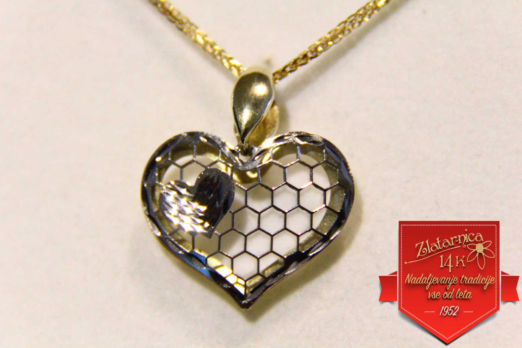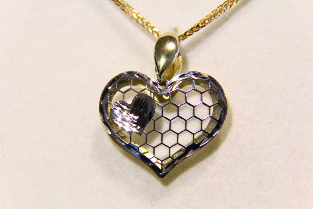 Obesek v obliki srca iz belega in rumenega zlata. Površina srca je mrežasta z dodanim manjšim srčkom.