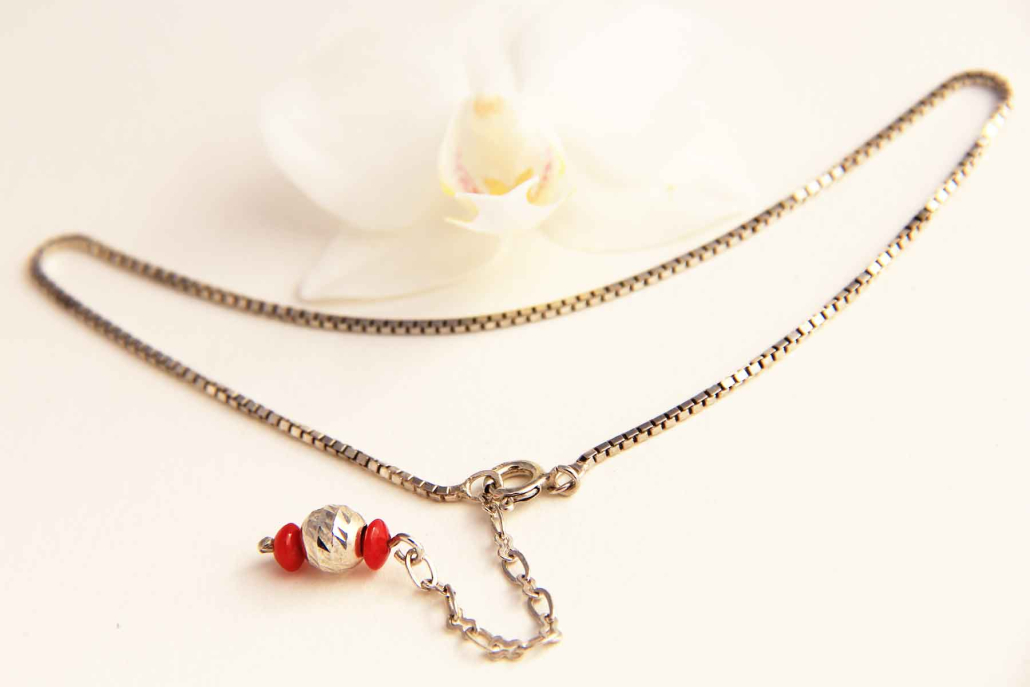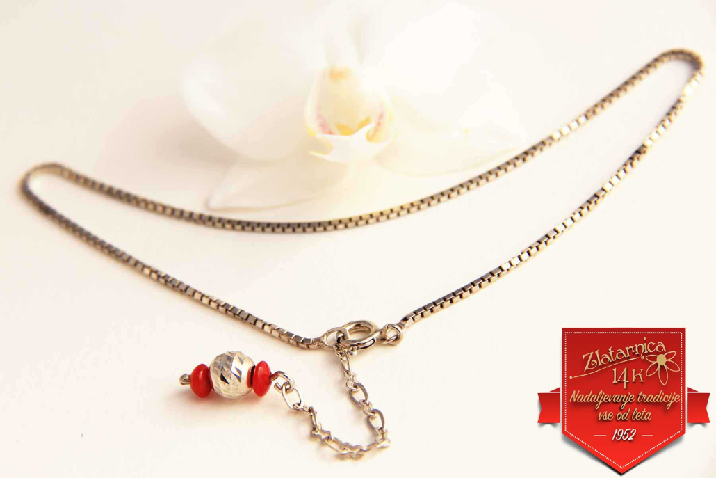 Nagležnica iz srebra, vzorca venecianer, z nastavljivim zaključkom s krogljicama iz korale in brušeno srebrno, v katereg lahko zapnete sponko verižice na poljubno dolžino.