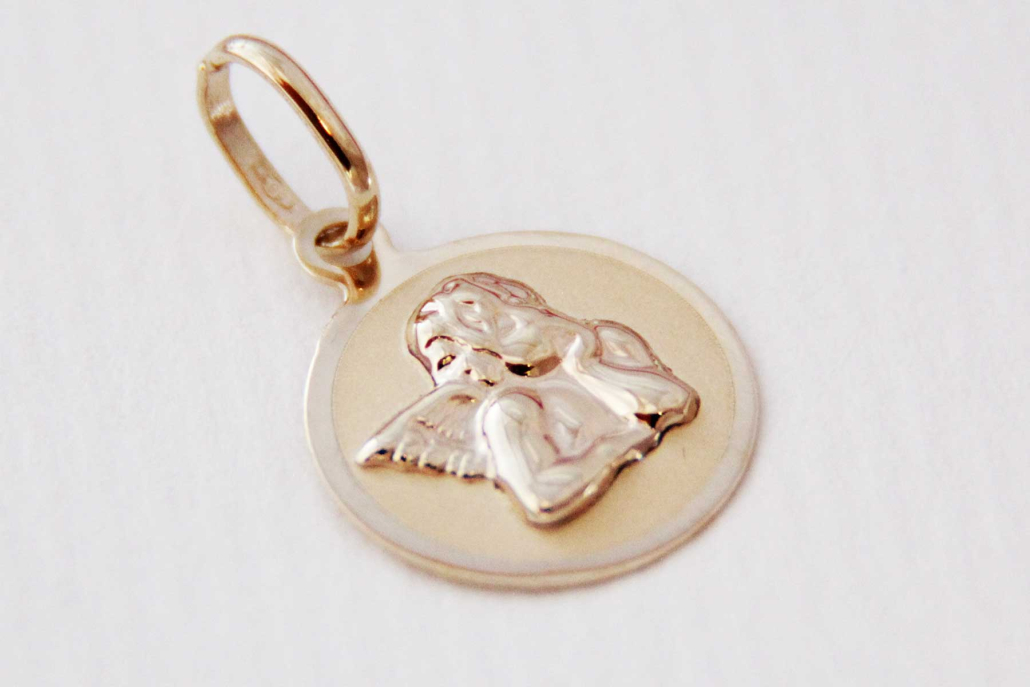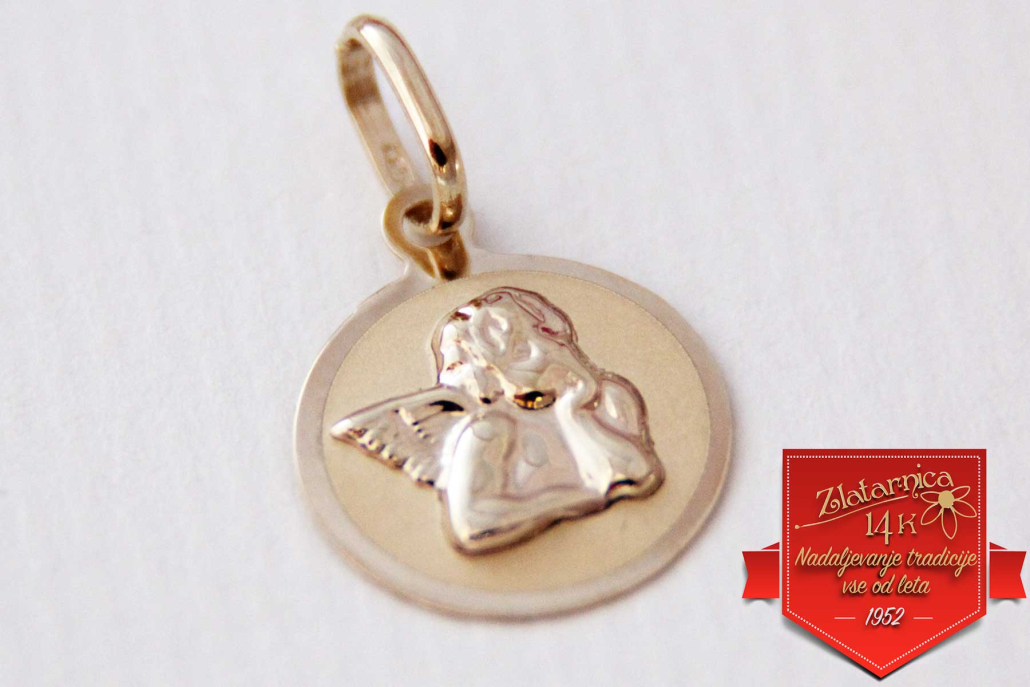 Zlata ploščica v obliki kroga s peskano podlago s slonečo podobo angela. Na hrbtni strani je možna gravura.