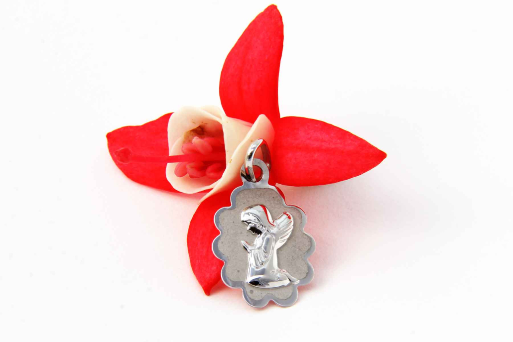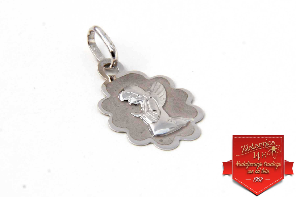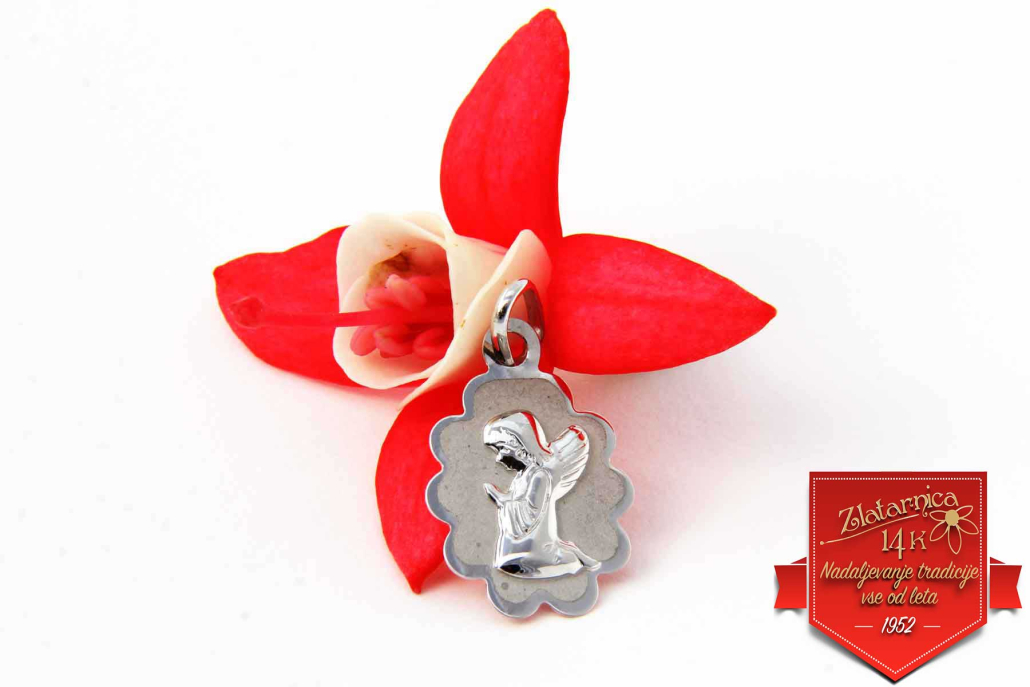 Zlata ploščica v obliki oblačka s peskano podlago s slonečo podobo angela. Na hrbtni strani je možna gravura.