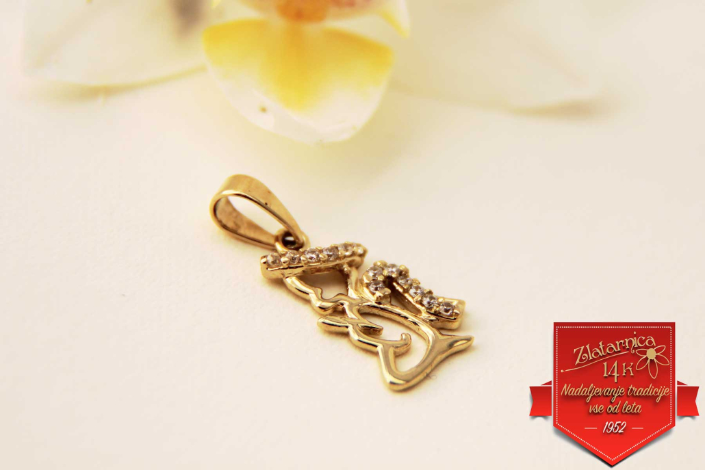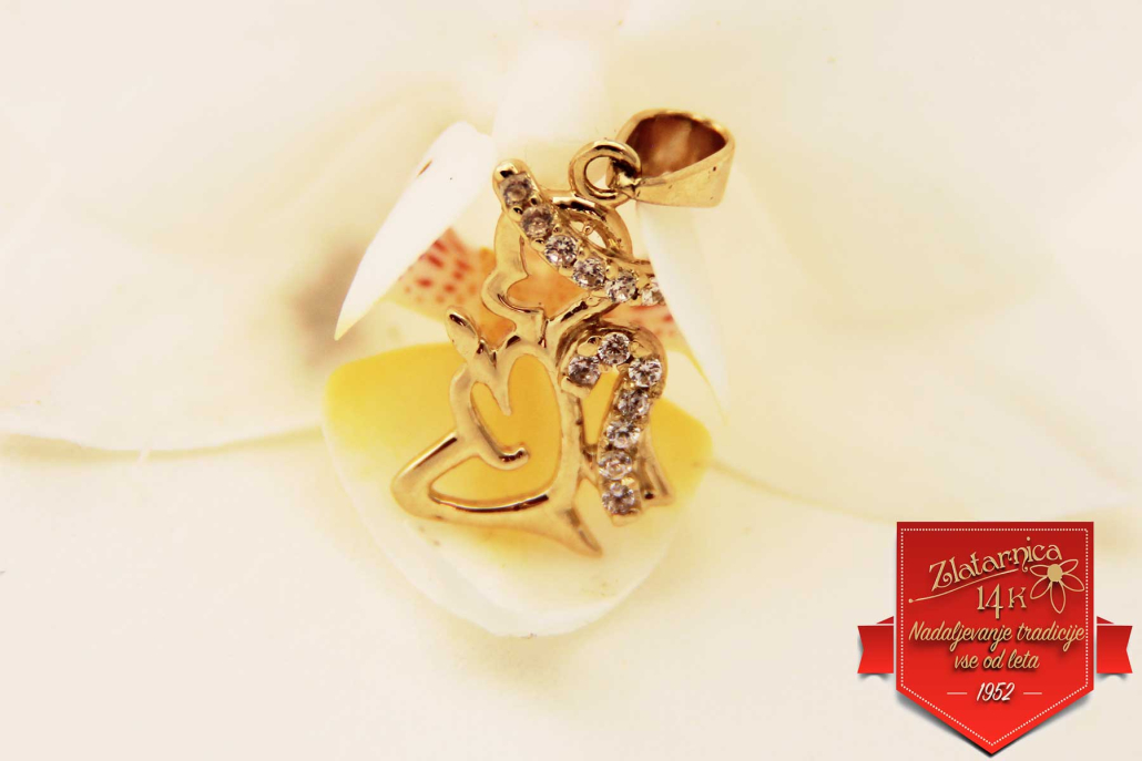 Obesek iz rumenega zlata v obliki silhuete stiliziranega angela, s vkovanimi cirkoni.
