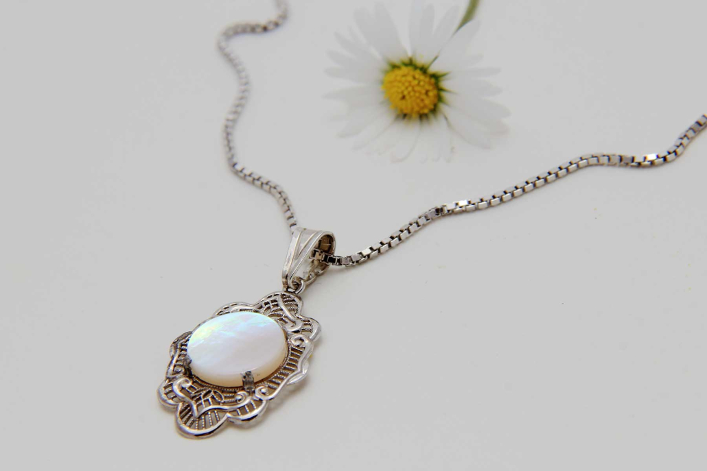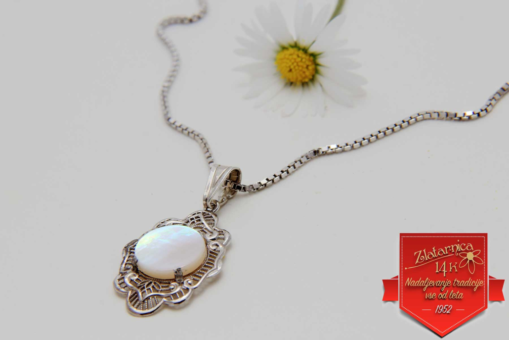 Srebrni obesek antičnega izgleda z biserno matico sive barve.