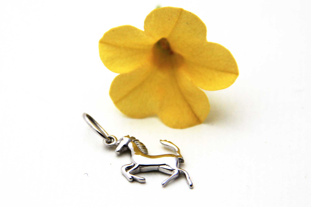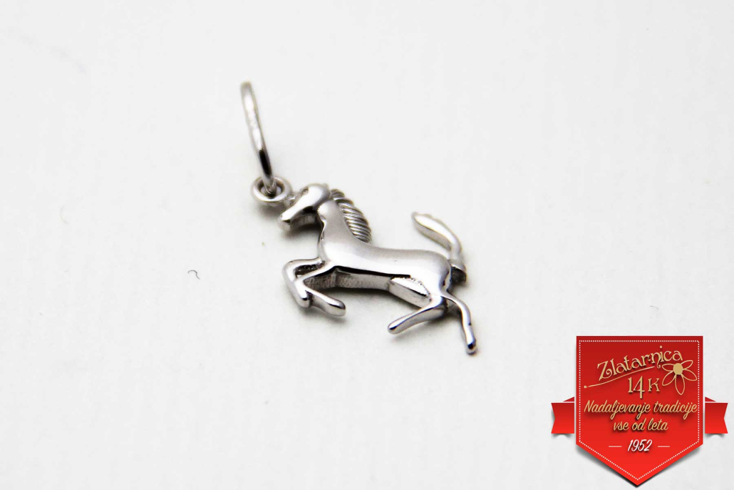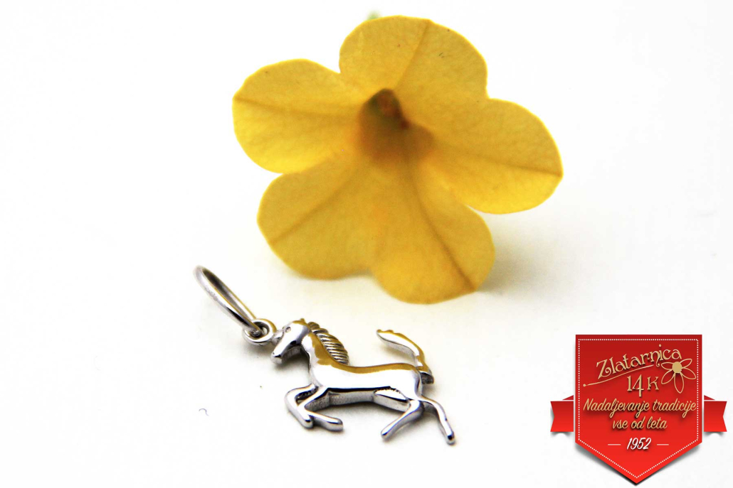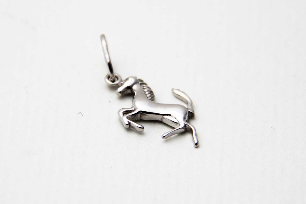 Obesek iz belega zlata v obliki Ferrarijevega konja-stoječega na zadnjih nogah z privzdignjenim repom.