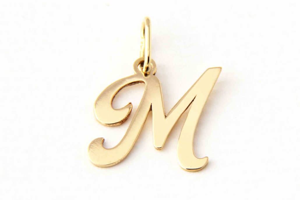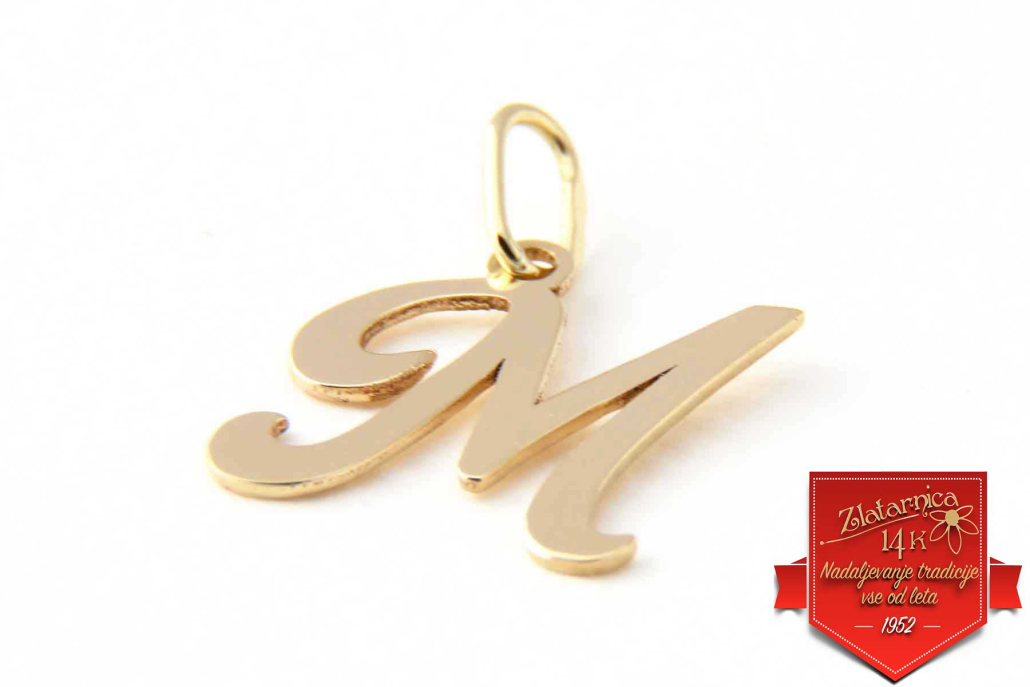 Obesek v obliki pisane začetnice “M” iz rumenega zlata z povdarjenimi detajli.