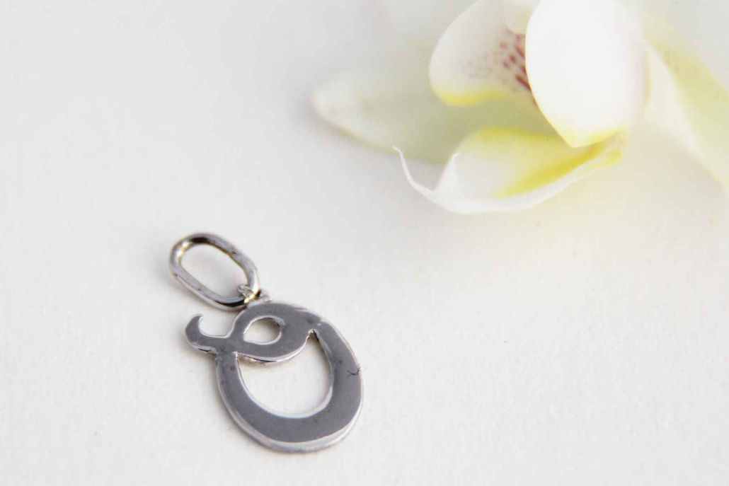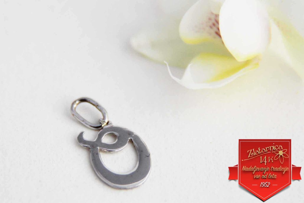 Obesek v obliki pisane začetnice “O” iz belega zlata z povdarjenimi detajli.
