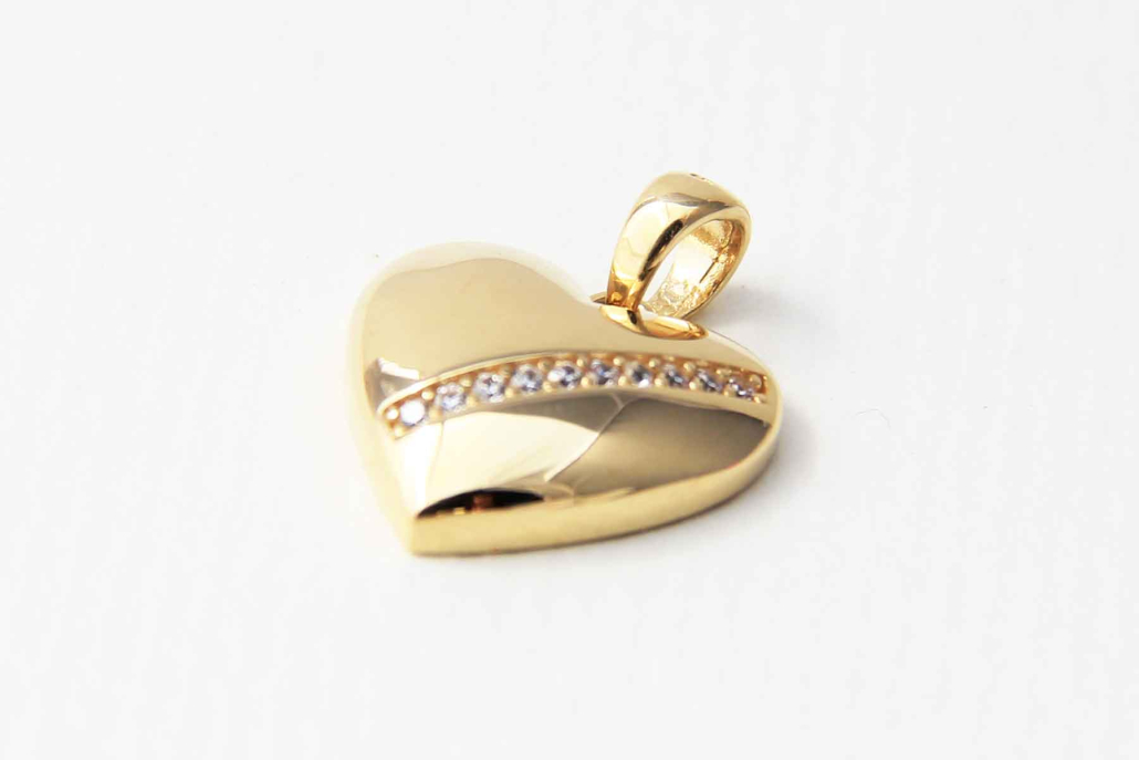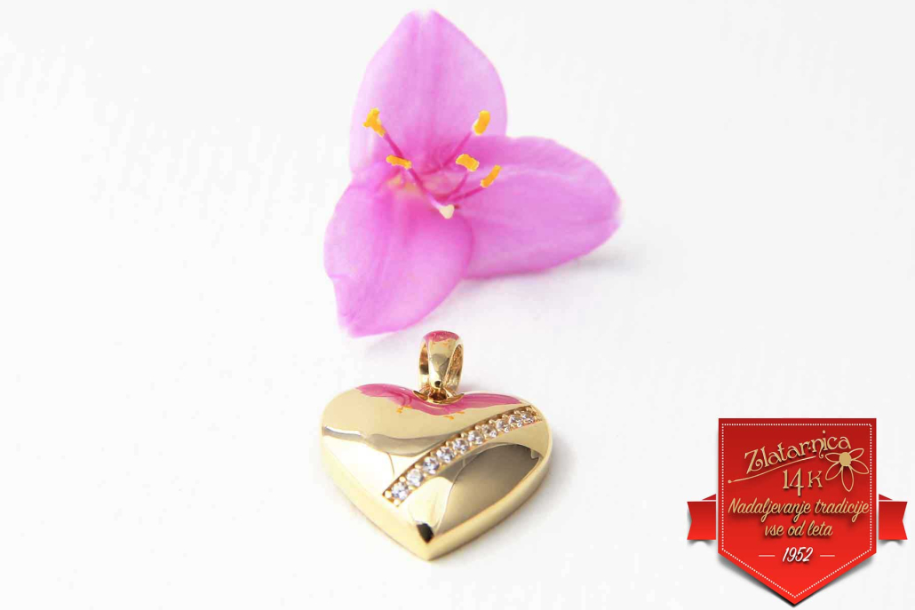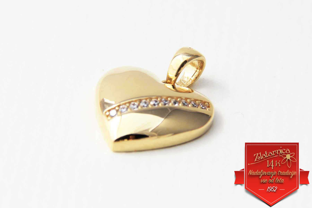 Obesek iz rumenega zlata v obliki srca s prečno linijo cirkonov.