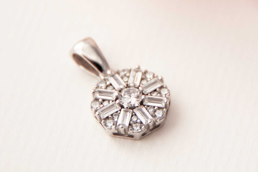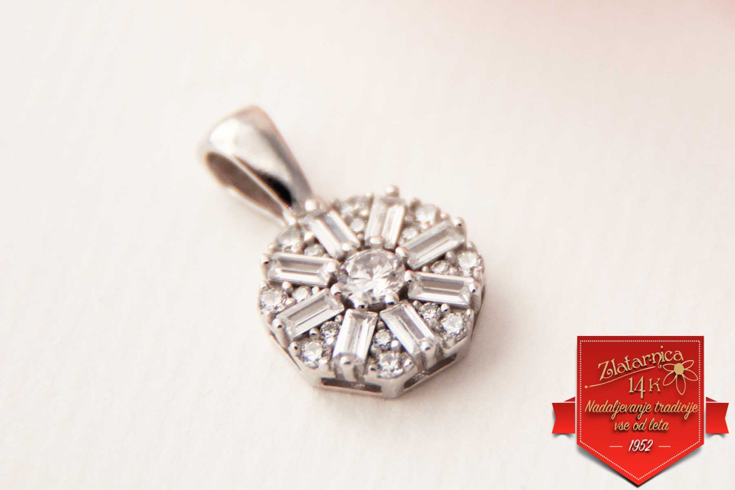 Okrogel srebrni obesek s cirkoni različnih oblik.