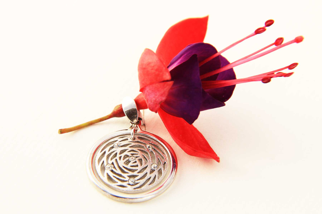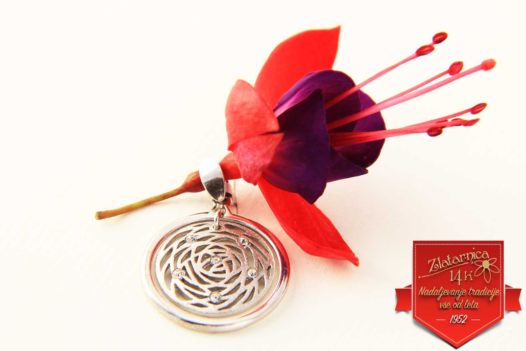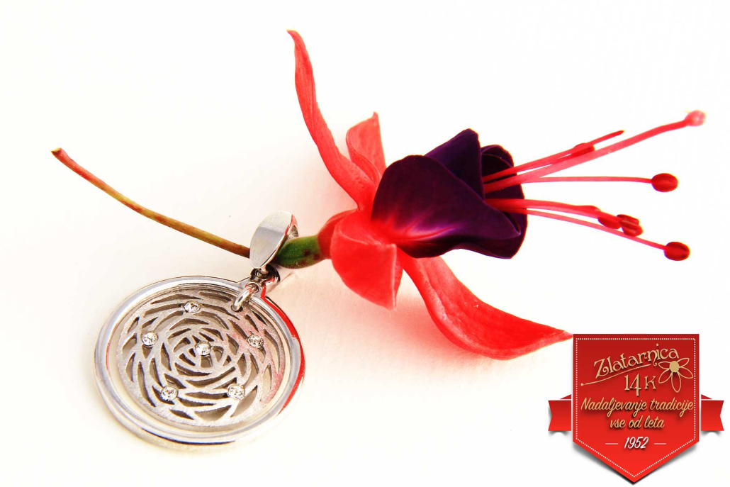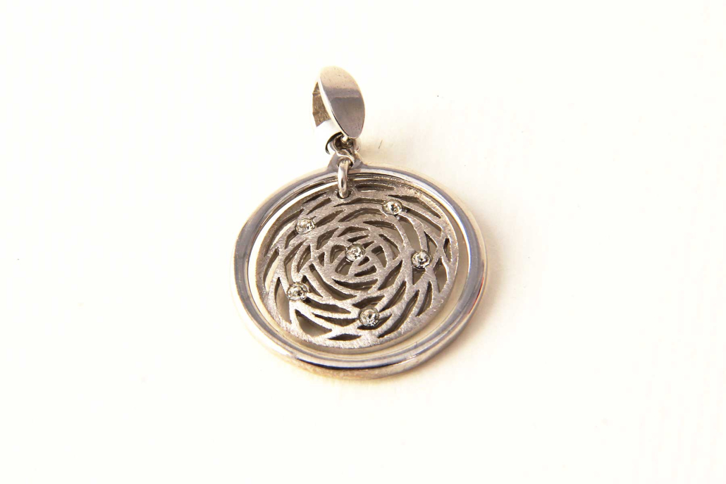 Srebrni talisman v obliki satiniranega kroga, s vkovanimi cirkoni in gladkim robom. Neprekinjen krog je tako kot osmica, simbol neskončnosti.