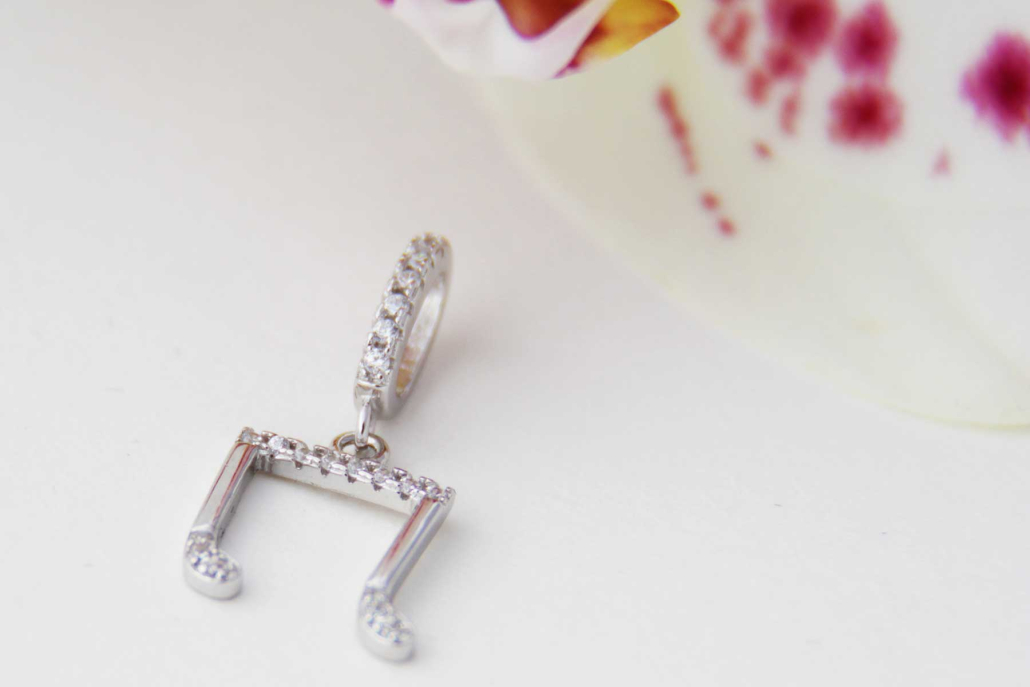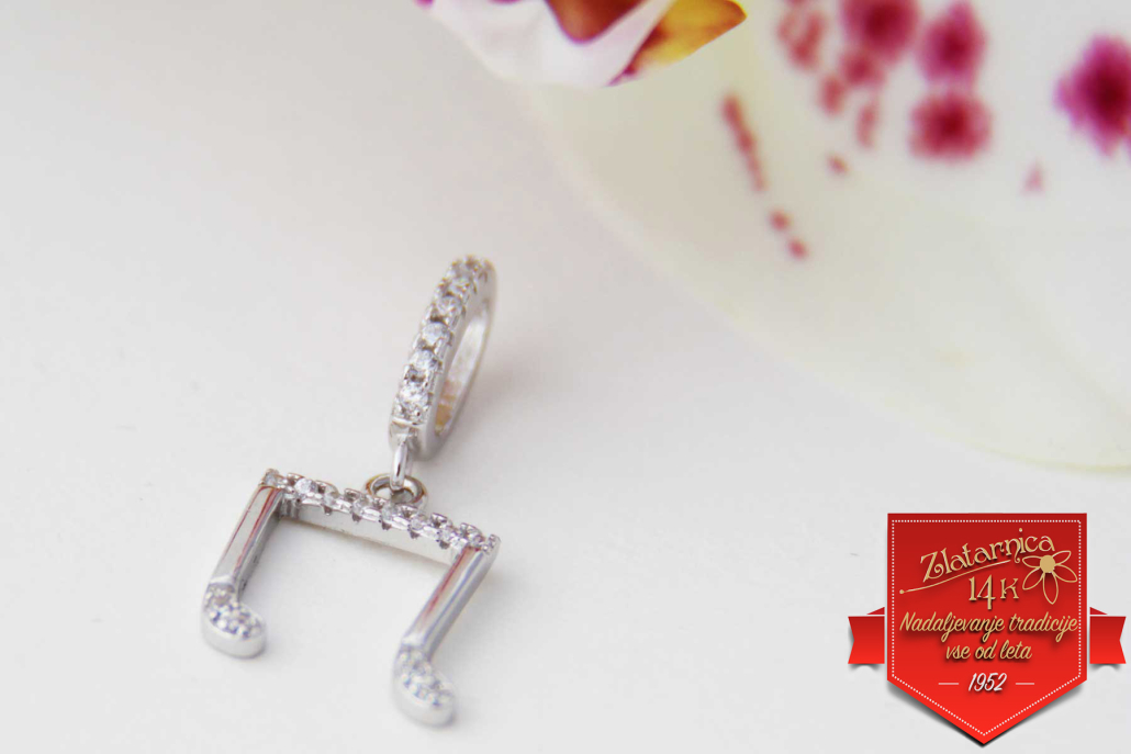 Srebrni obesek v obliki note, v katero so vkovani cirkoni. Pravtako so cirkoni vkovani v obroček za obešanje.