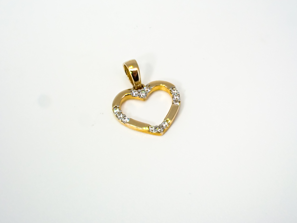Obesek iz rumenega zlata v obliki srca in okrašen s cirkoni po robovih.
