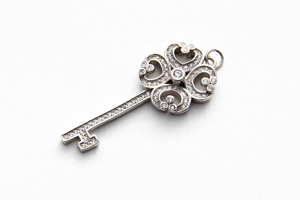 Prefinjen obesek v obliki ključa v celoti obdelan z drobnimi cirkoni.