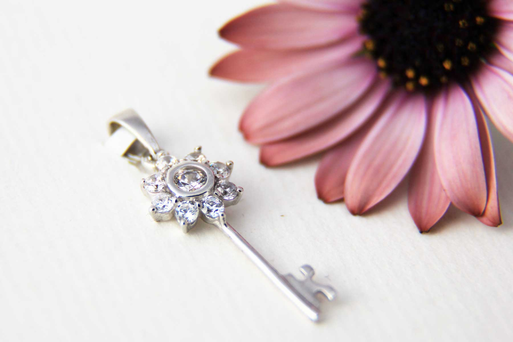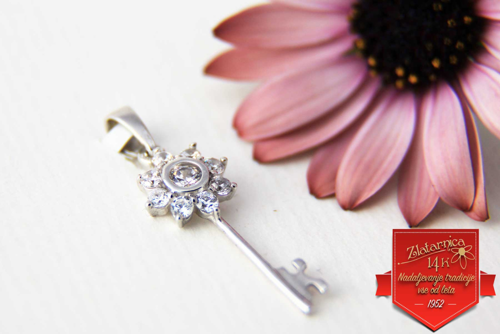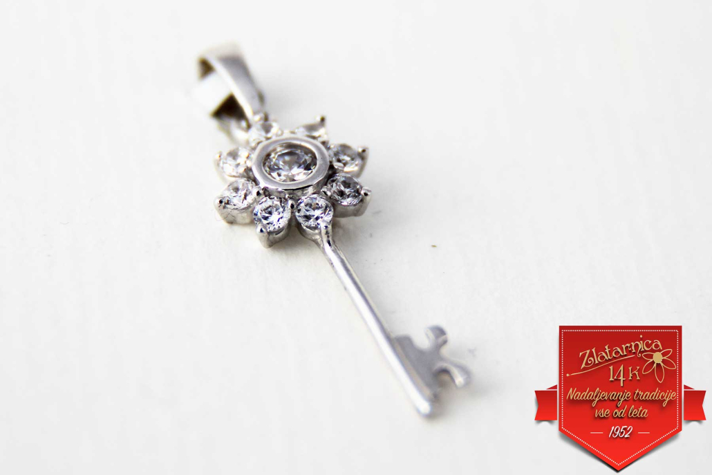 Srebrni obesek v obliki ključa z rožico iz cirkonov.