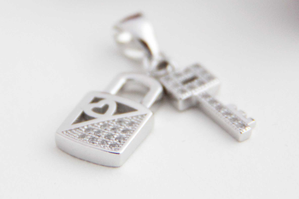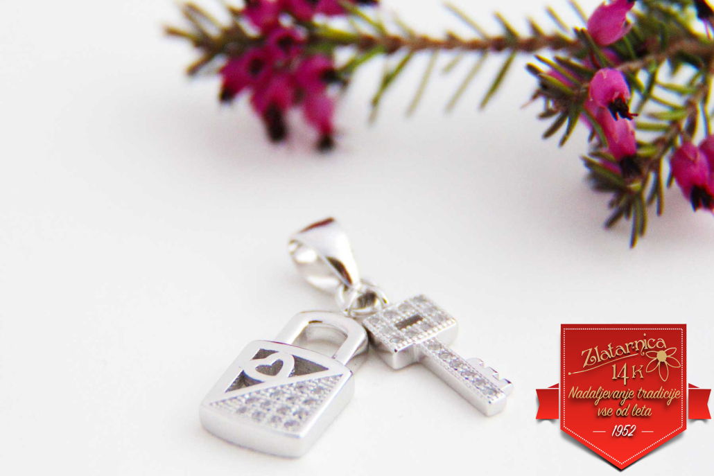 Srebrni obesek iz dveh delov: ključa in ključavnice. Površina ključa je obdelana s cirkoni. Tudi polovica površine ključavnice je obdelana s cirkoni, v drugo polovico je dodano srce.