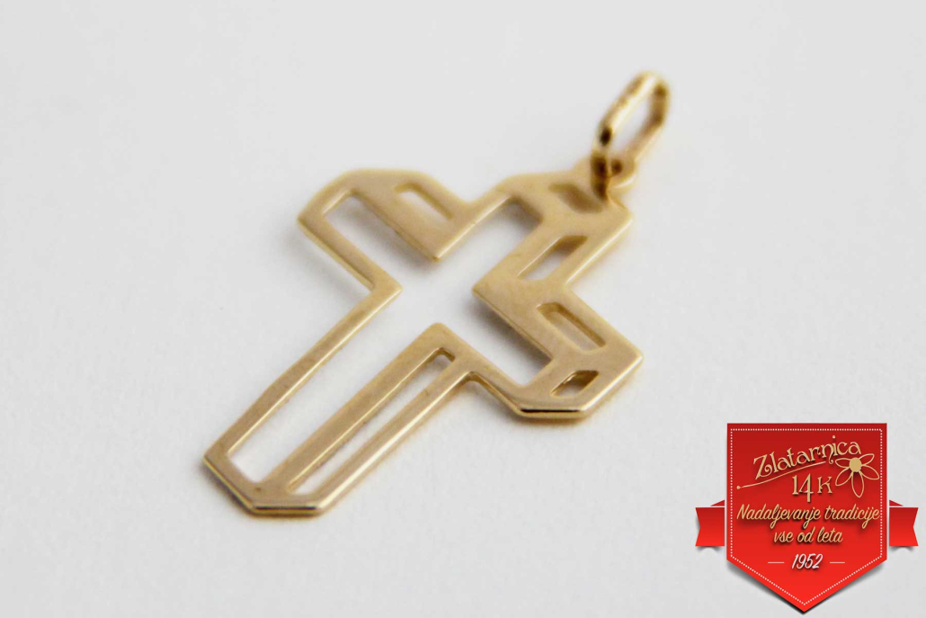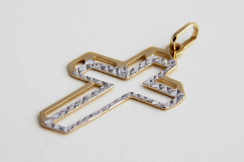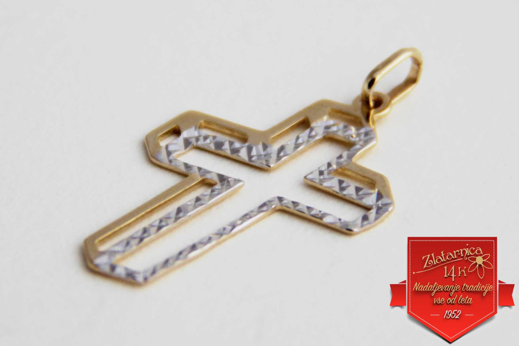 Križ iz rumenega zlata s gravuro v belem zlatu.