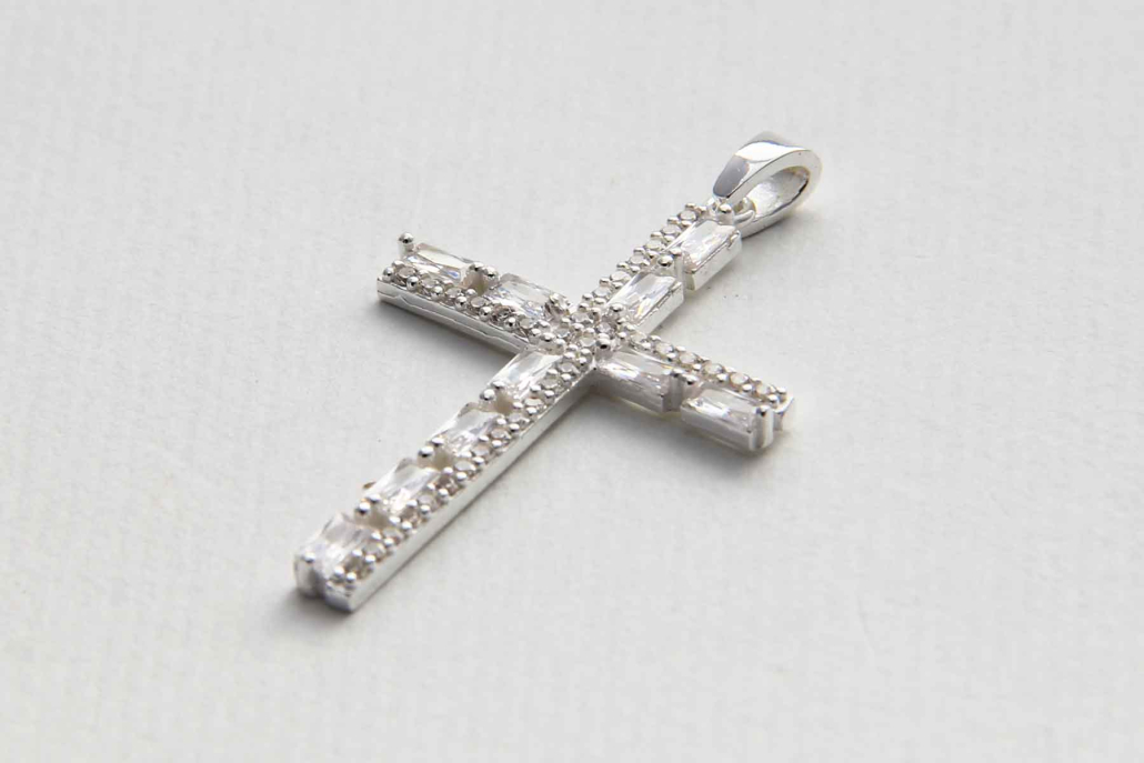 Prefinjen križ v celoti obdelan z vzdolžnimi in drobnimi cirkoni.