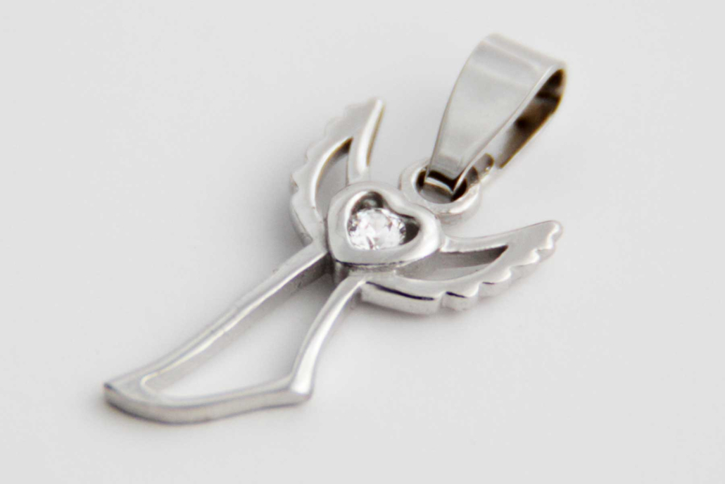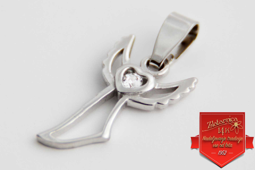 Obesek iz belega zlata v obliki letečega angelčka s cirkonom v srčku.