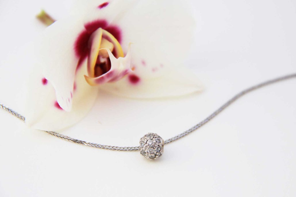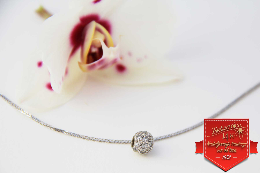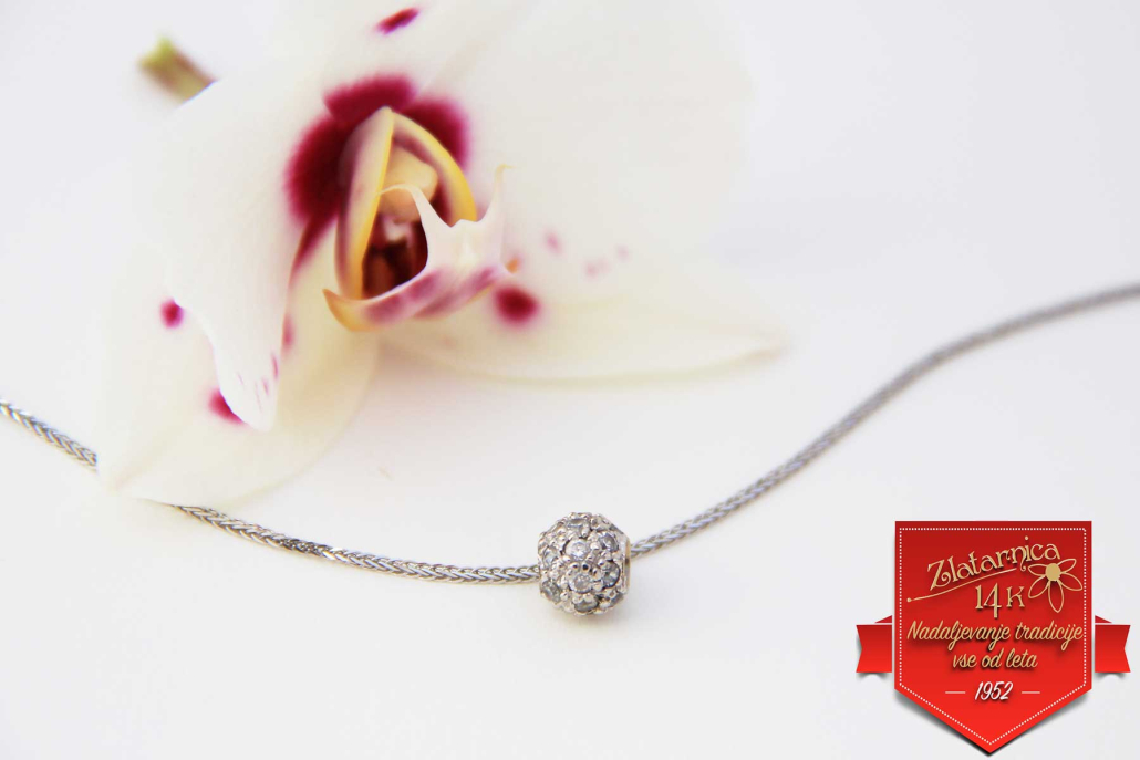 Obesek v obliki male krogljice obdelane s cirkoni, skozi katero se napelje verižica.