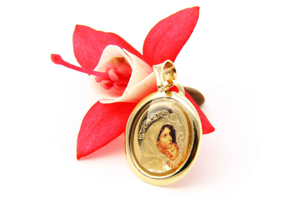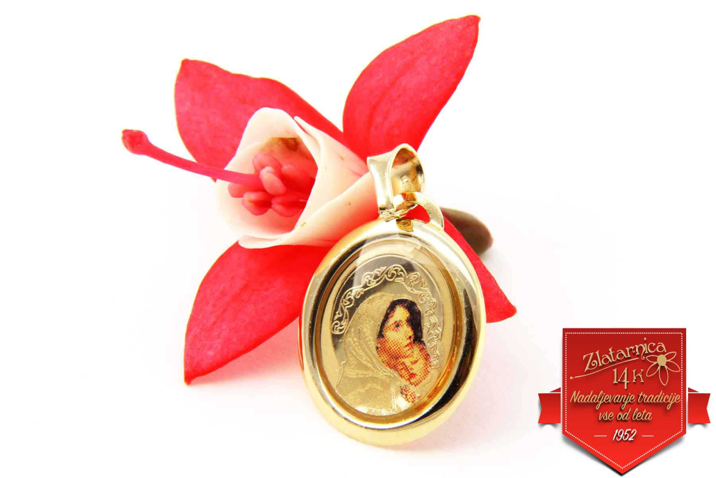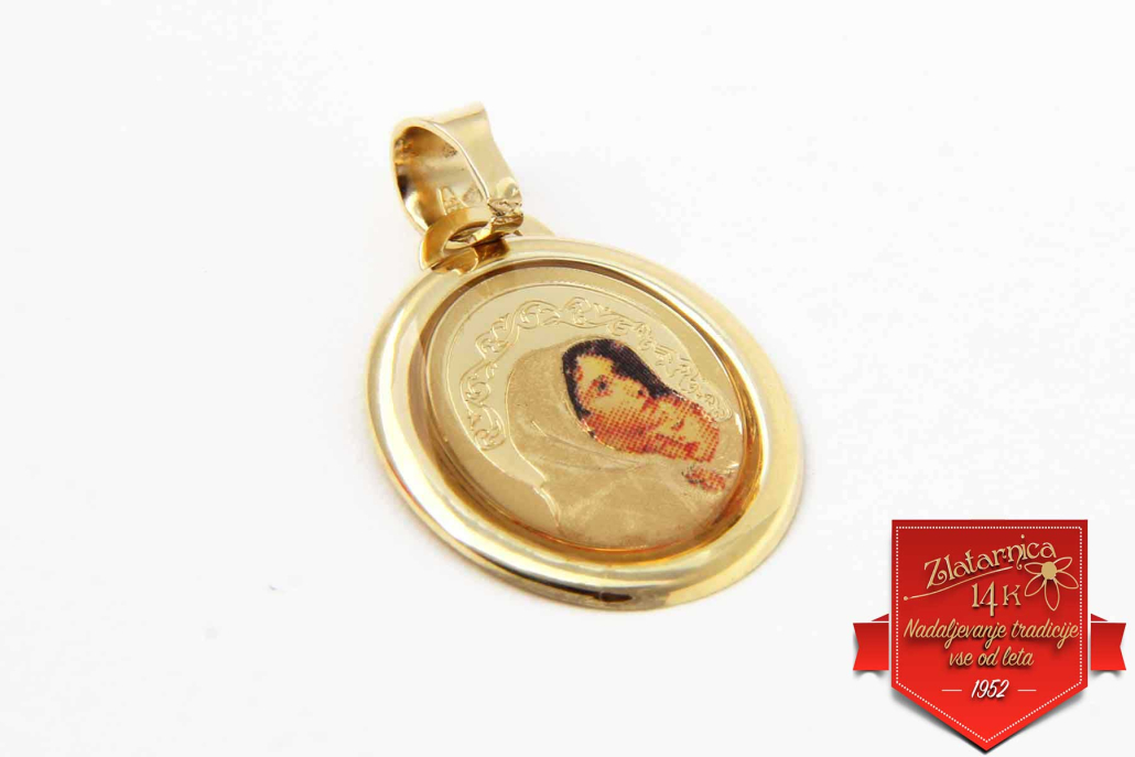 Čudovit obesek v obliki ovalne ploščice, s podobo device Marije v barvnem emajlu. Na hrbtni strani je možna gravura.