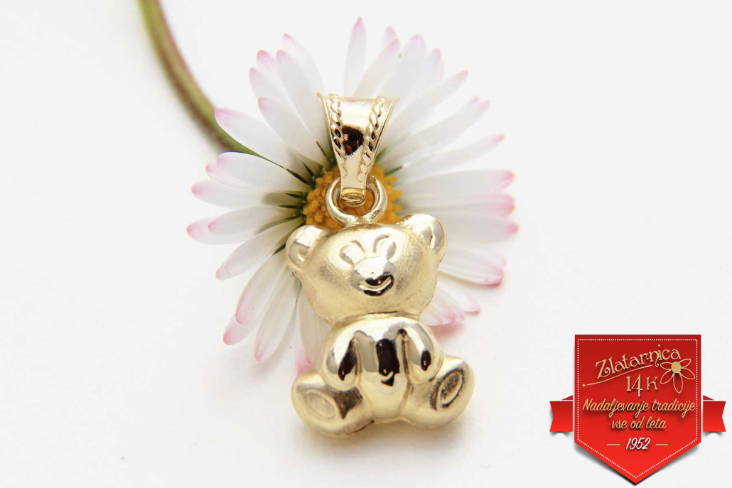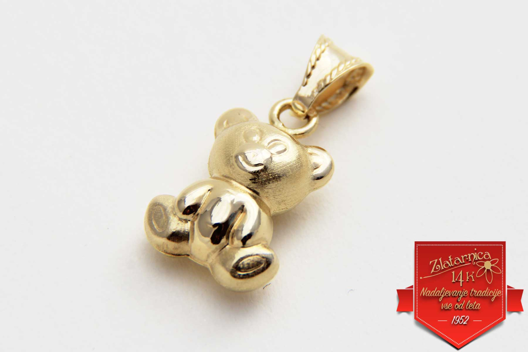 Ljubki otroški obesek v obliki medvedka iz rumenega zlata z matiranimi detajli.