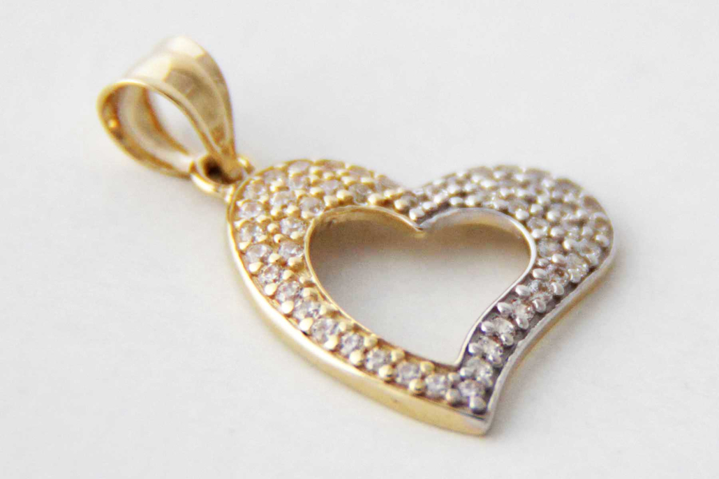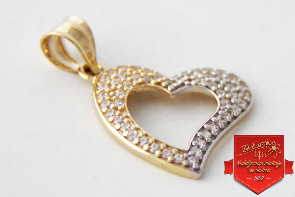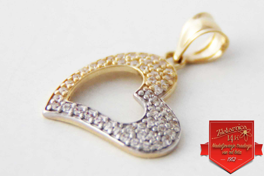 Obesek iz rumenega in belega zlata, srce s cirkoni.