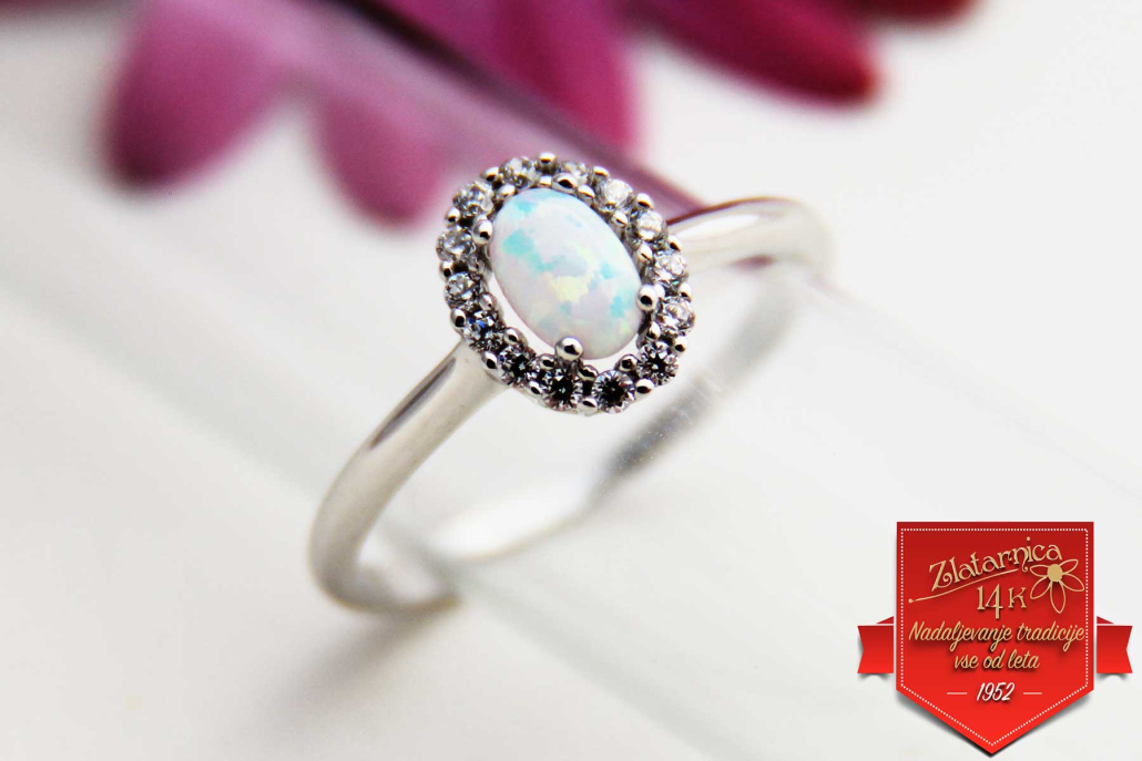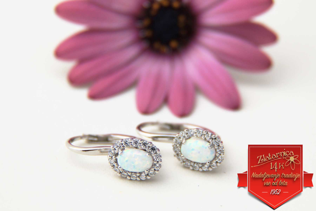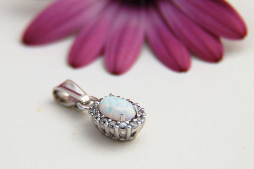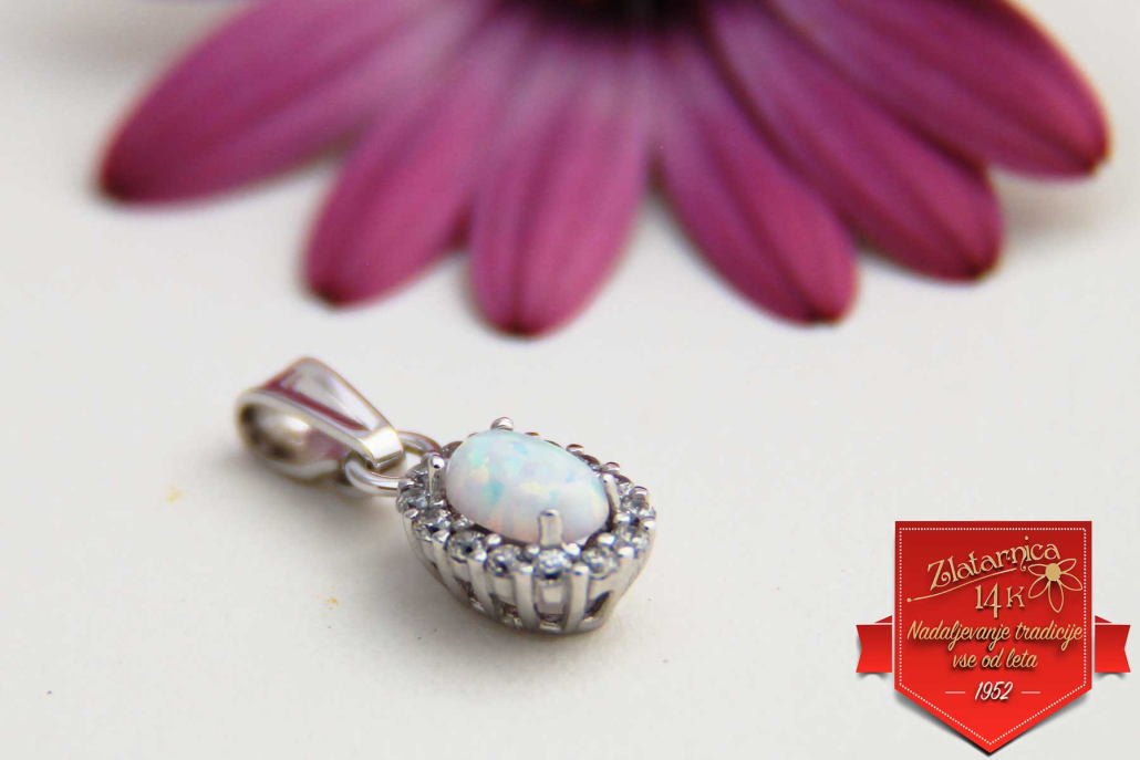 Obesek iz belega zlata z mlečnim opalom ovalne oblike, obrobljen s cirkoni.