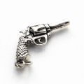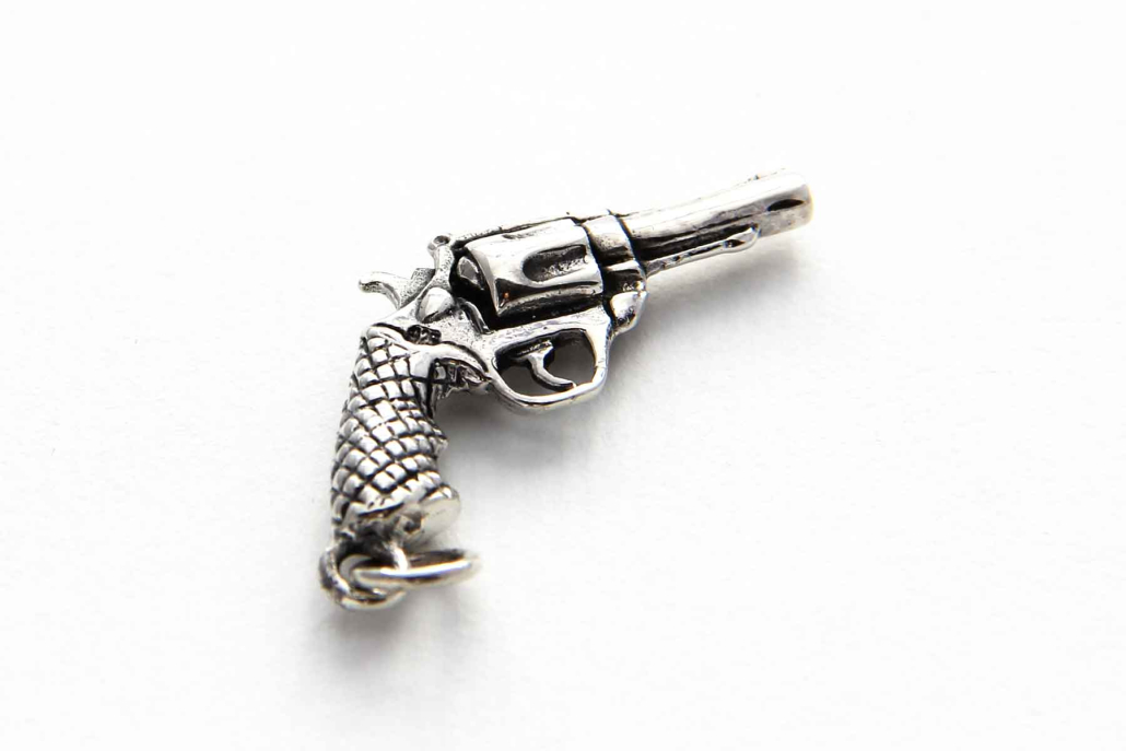 Srebrni obesek v obliki pištole z patiniranimi detajli.
