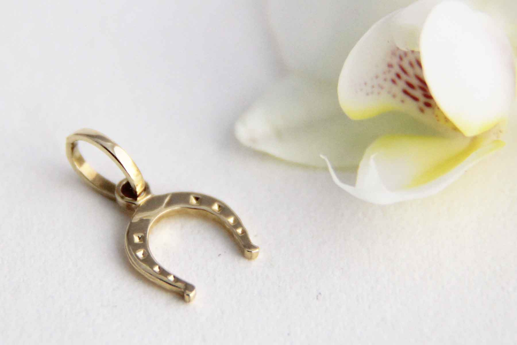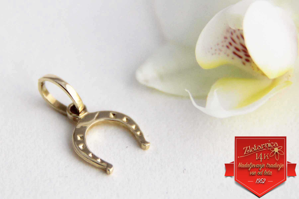 Zlat obesek v obliki podkve s povdarjenimi linijami z gravuro.